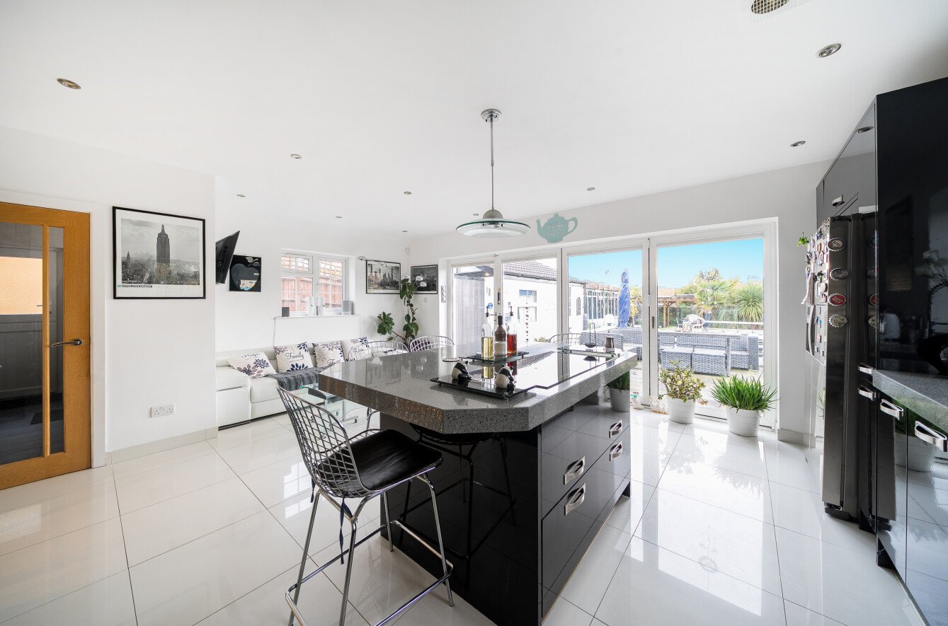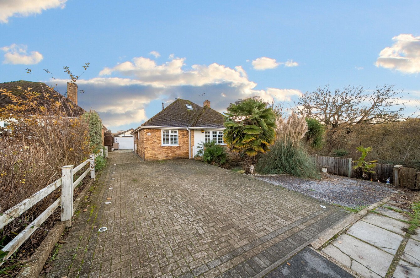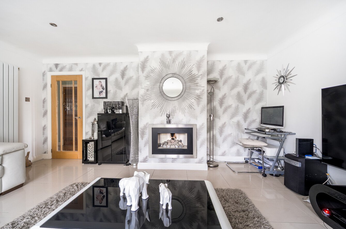 The home is approached via a generous driveway providing ample off-road parking and benefits from a detached garage with power and lighting. Inside, the ground floor comprises an entrance hallway, a sitting room to the front, two double bedrooms served by a stylish four-piece family bathroom, and a fantastic open-plan kitchen, dining, and family room with integrated appliances and bi-fold doors opening onto the south-facing rear garden. The ground floor accomodation is complted by the handy addition of a utlity room.