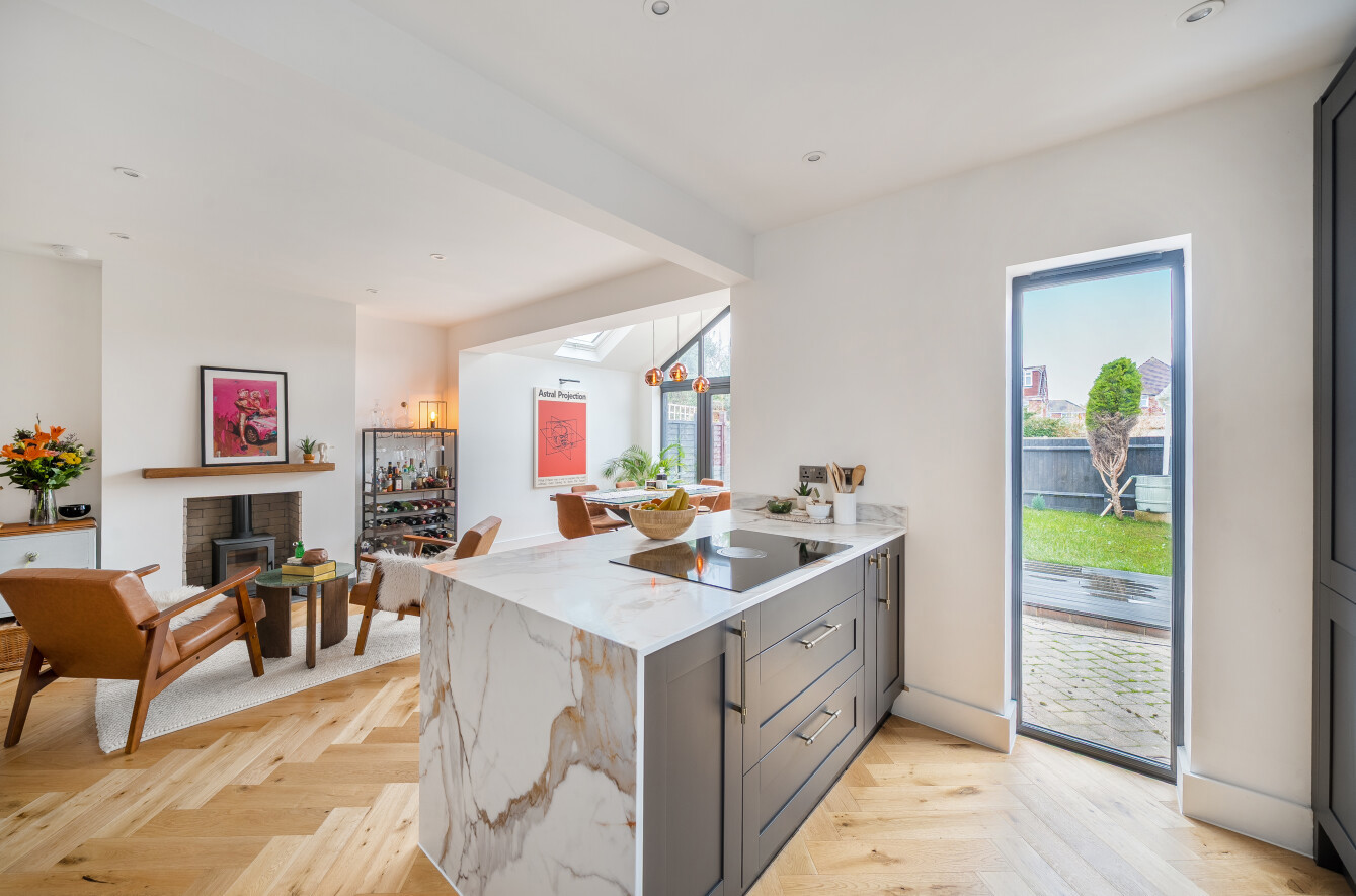 The ground floor accomodation comprises a handy storm porch with access to the entrance hallway with solid oak flooring, stairs rising to the first floor and doors leading to the sitting room to the front of the home with feature bay window, oak flooring and open fireplace with log burning stove. To the rear of the home you will find the show stopping open plan kitchen dining and family room with bi fold doors leading to the rear garden and offering the ideal space for entertaining family and friends.