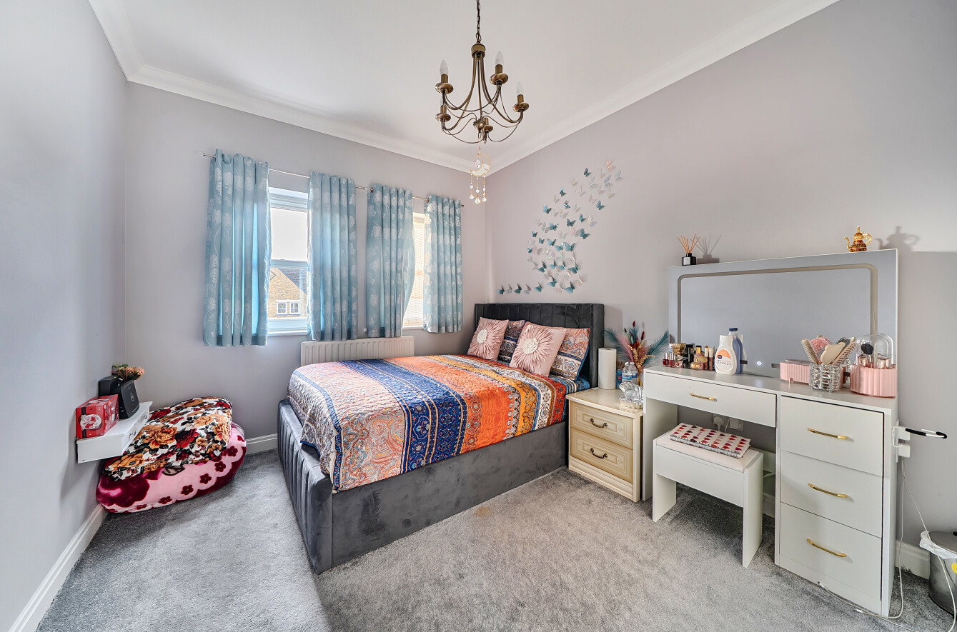 On the first floor, the landing leads to the living room, kitchen/dining room, and an additional cloakroom. The L-shaped living room sits to the front and is flooded with natural light from a large window, while French doors open to an elegant Juliette balcony. To the rear, the beautifully finished kitchen/dining room features a range of fitted wall and base units, a useful breakfast bar, and a selection of integrated appliances.