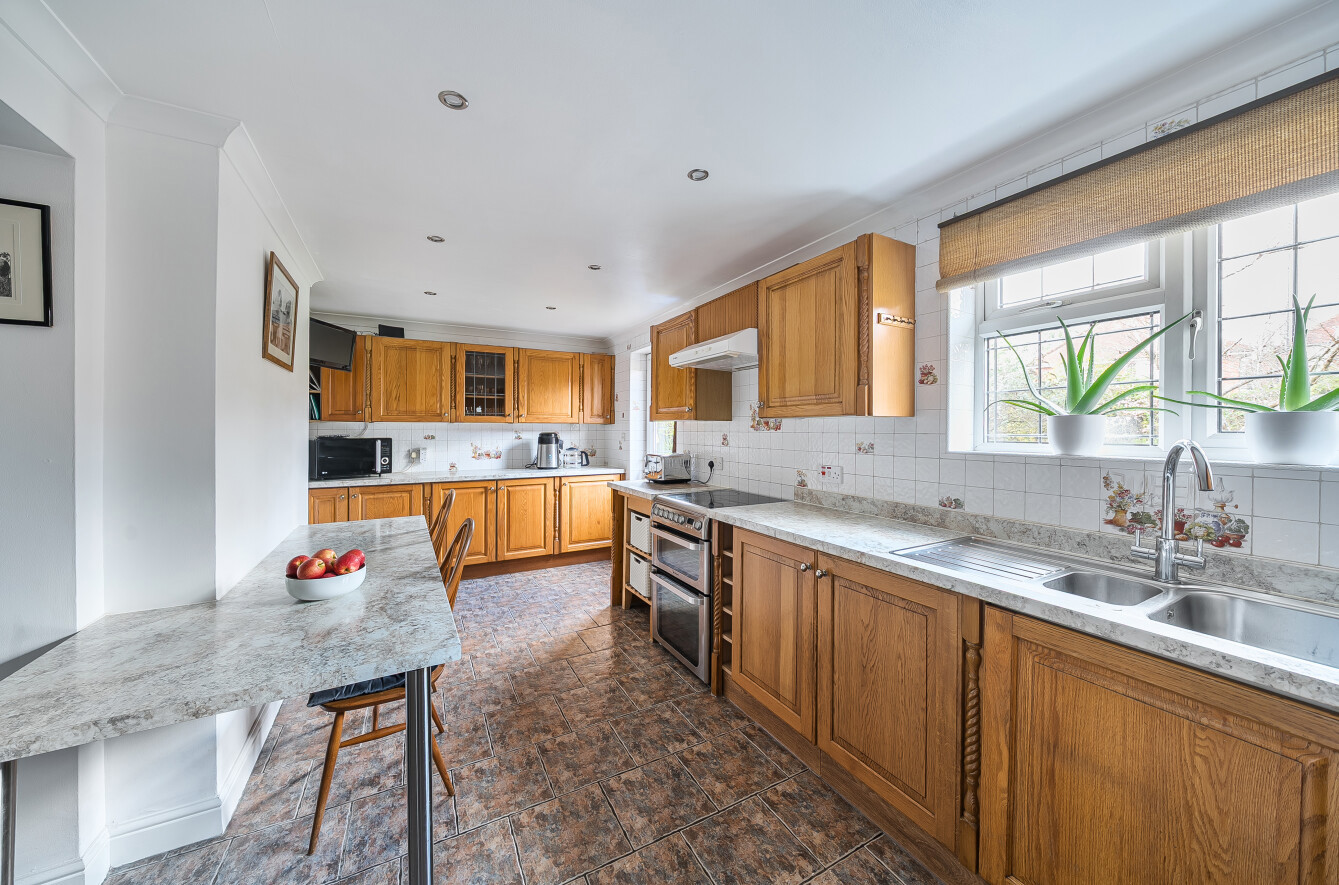 The well-proportioned and favourably laid-out accommodation on the ground floor comprises an entrance hallway with stairs rising to the first floor and doors leading to the sitting room with bay window, which could be an ideal space for a home office, gym, or separate children’s playroom.