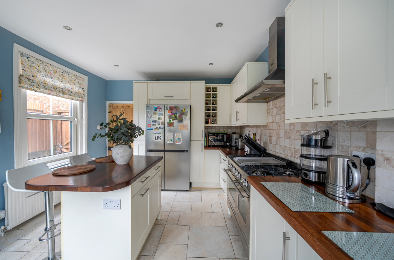 The well proportioned and well presented accommodation on the ground floor comprises the welcoming entrance hallway with stairs rising to the first floor and doors leading to the bright and sunny sitting room to the front of the home with feature bay window, ornate coving and decorative fireplace, and the second reception room with bespoke fitted shelving, cast iron feature fireplace and ornate decorative coving and makes the ideal space for a separate children’s play room.