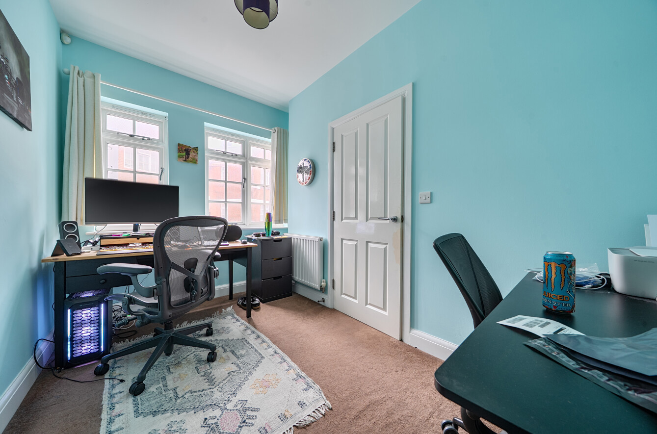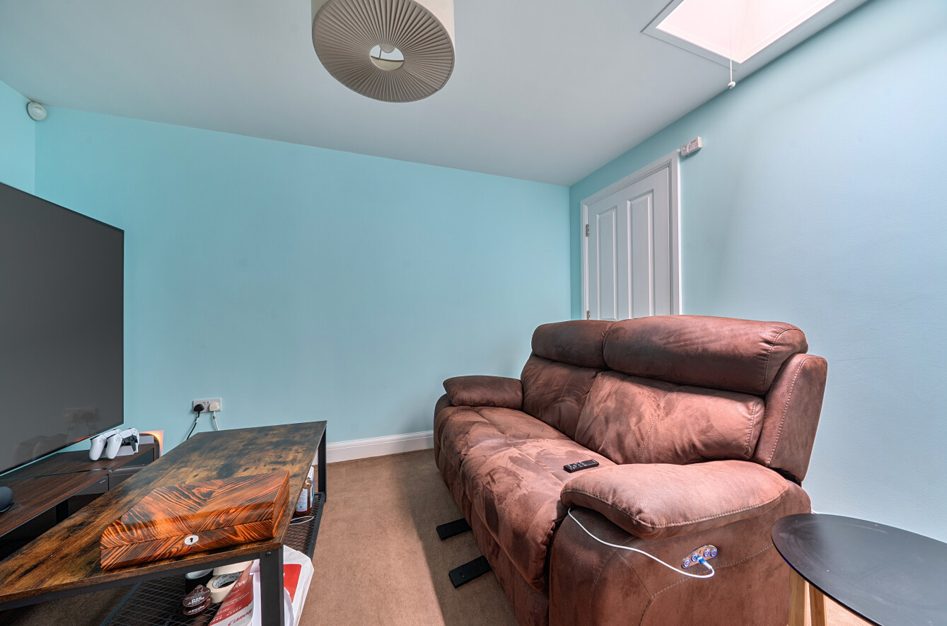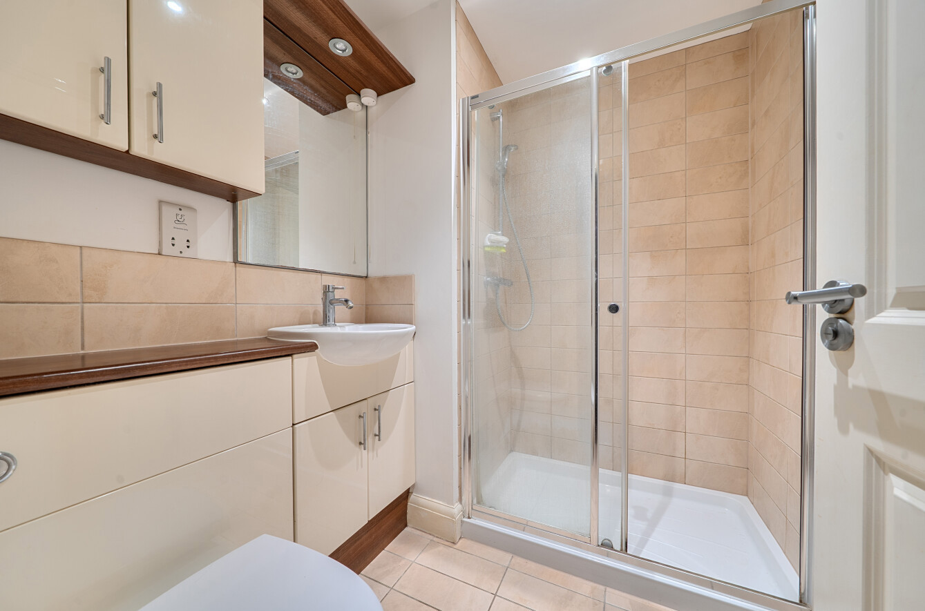 The upper level is dedicated to two substantial double bedrooms, both served by an elegant shower room finished with a walk-in glass enclosure, sleek vanity storage, and integrated fittings.