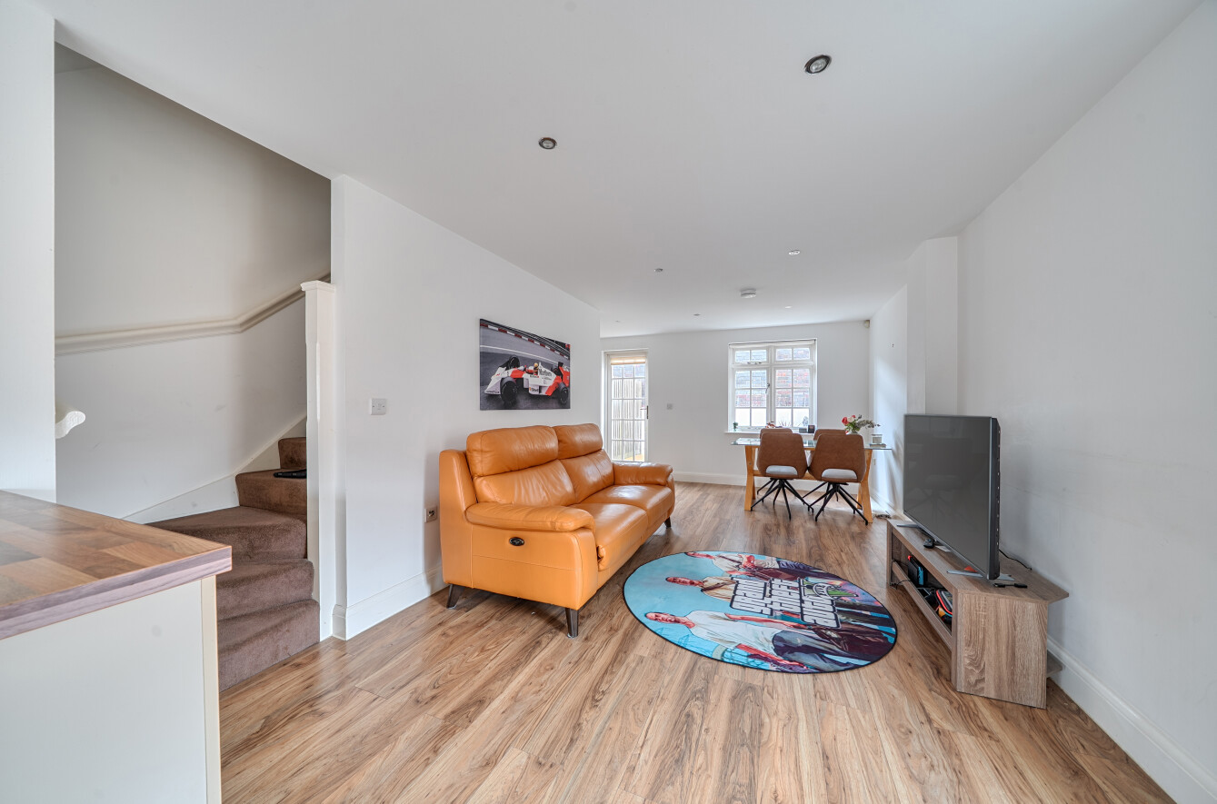 Occupying the entire first floor is a spectacular open-plan living environment that forms the social centre of the home. Bathed in daylight from windows on three sides, this impressive space seamlessly accommodates a contemporary kitchen, dining area, and comfortable lounge, perfectly suited to hosting or everyday living. The kitchen is smartly finished with gloss cream units, contrasting worktops, integrated cooking appliances, and space for a full range of white goods. Glazed French doors extend the living area outdoors onto a secluded courtyard garden, offering a private spot to unwind, dine, or entertain.