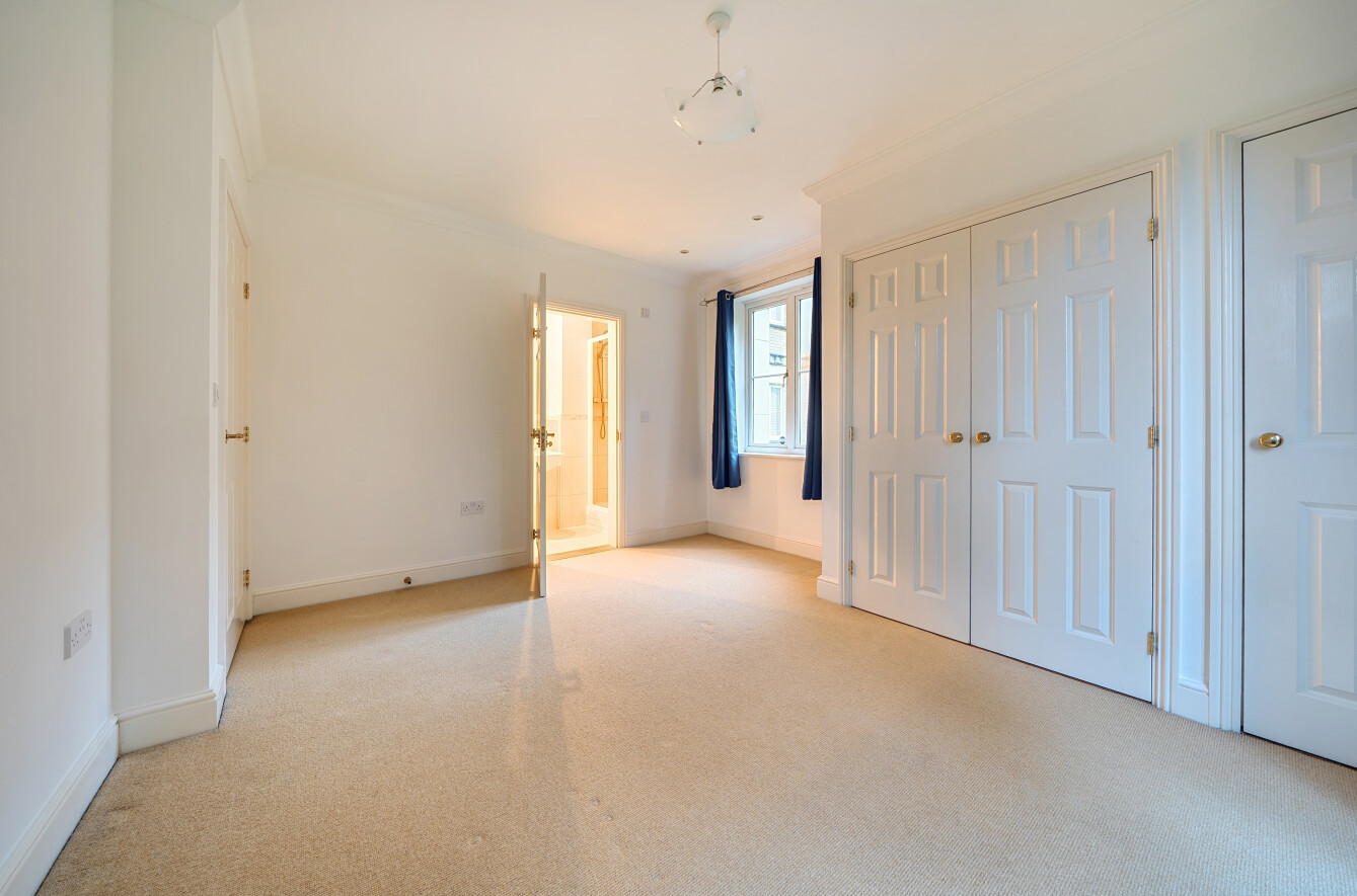 Positioned to the left are two generously proportioned bedrooms, both benefiting from fitted storage. The principal bedroom further enjoys a stylish Juliette balcony and the convenience of a modern en-suite shower room, featuring a corner enclosure, semi-pedestal wash hand basin, and concealed-cistern WC.