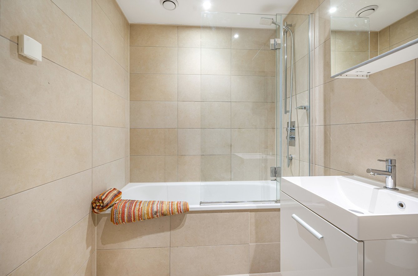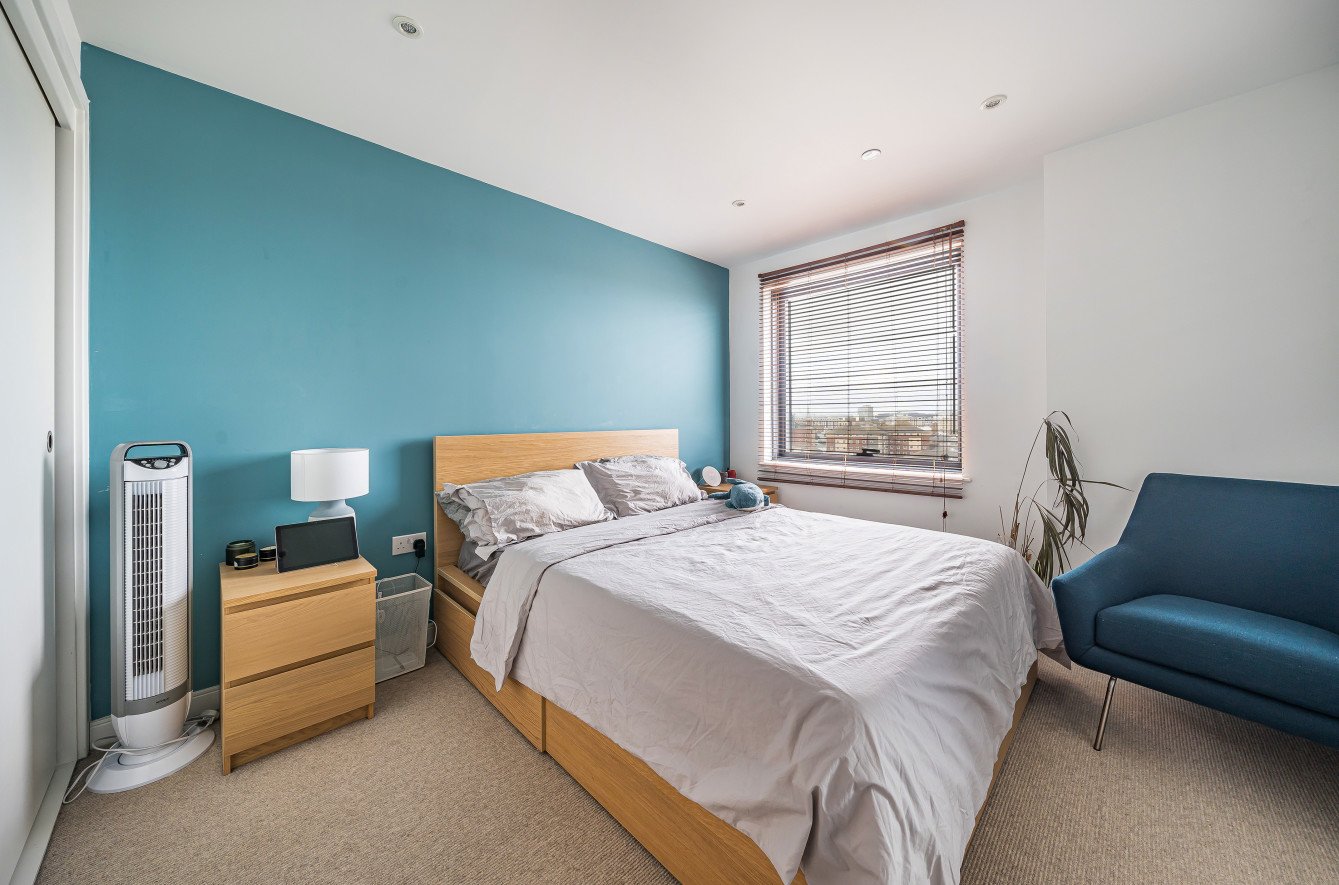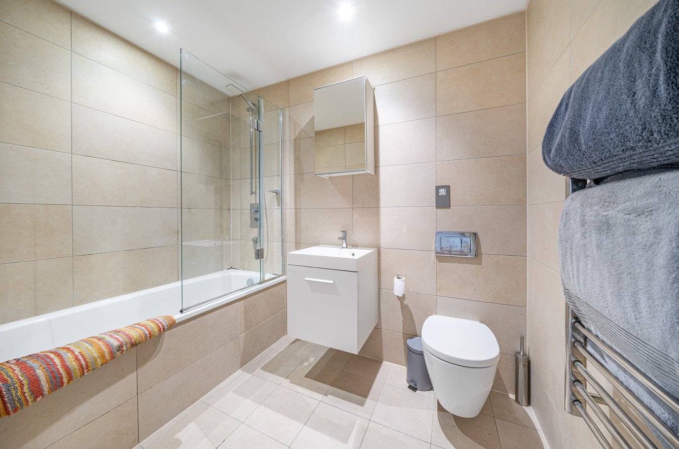 The spacious double bedroom benefits from a built-in wardrobe and large windows that flood the room with natural light, while the sleek bathroom showcases floor-to-ceiling contemporary tiling, a wall-hung toilet, and a vanity sink for a refined finish.