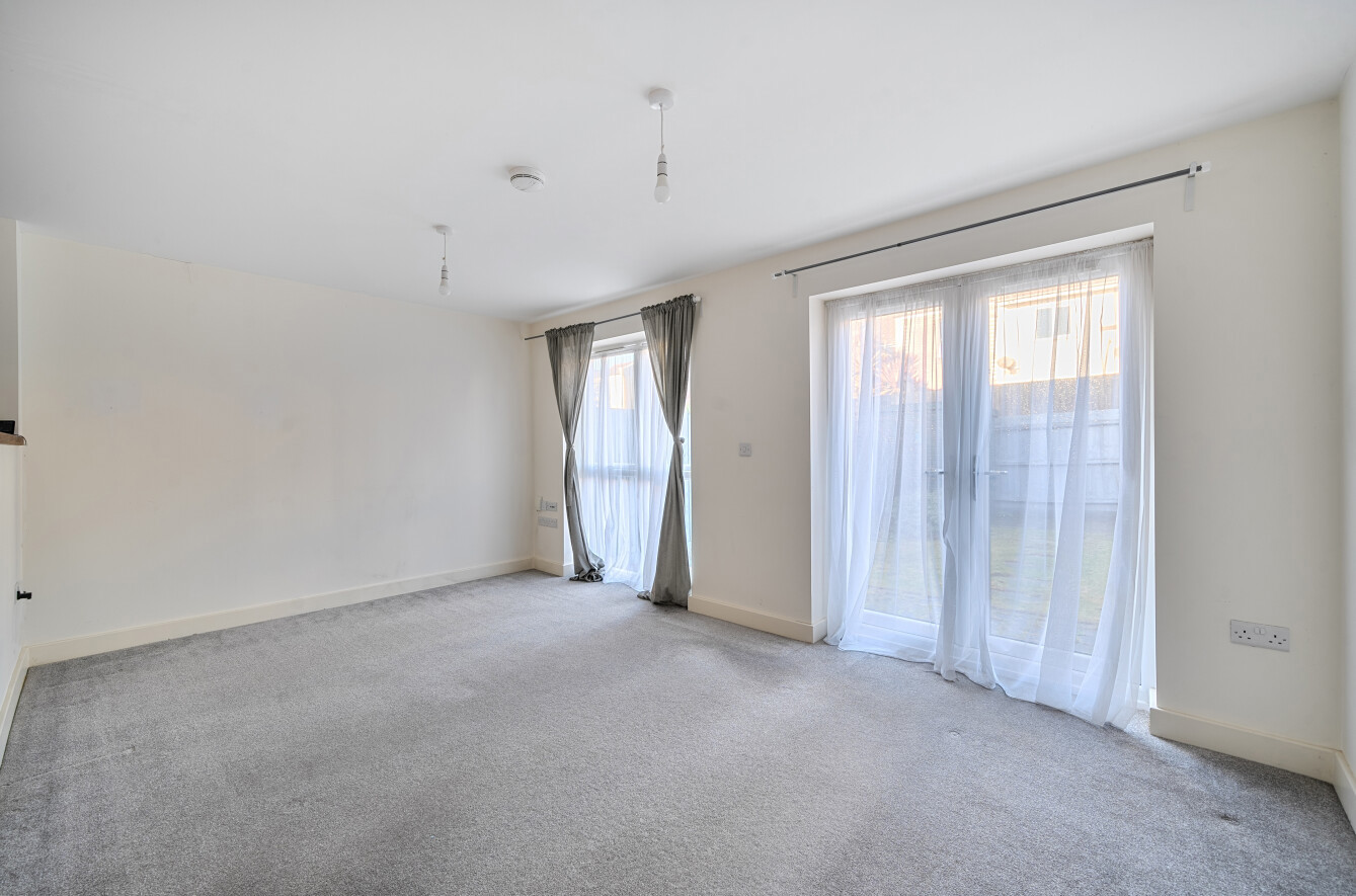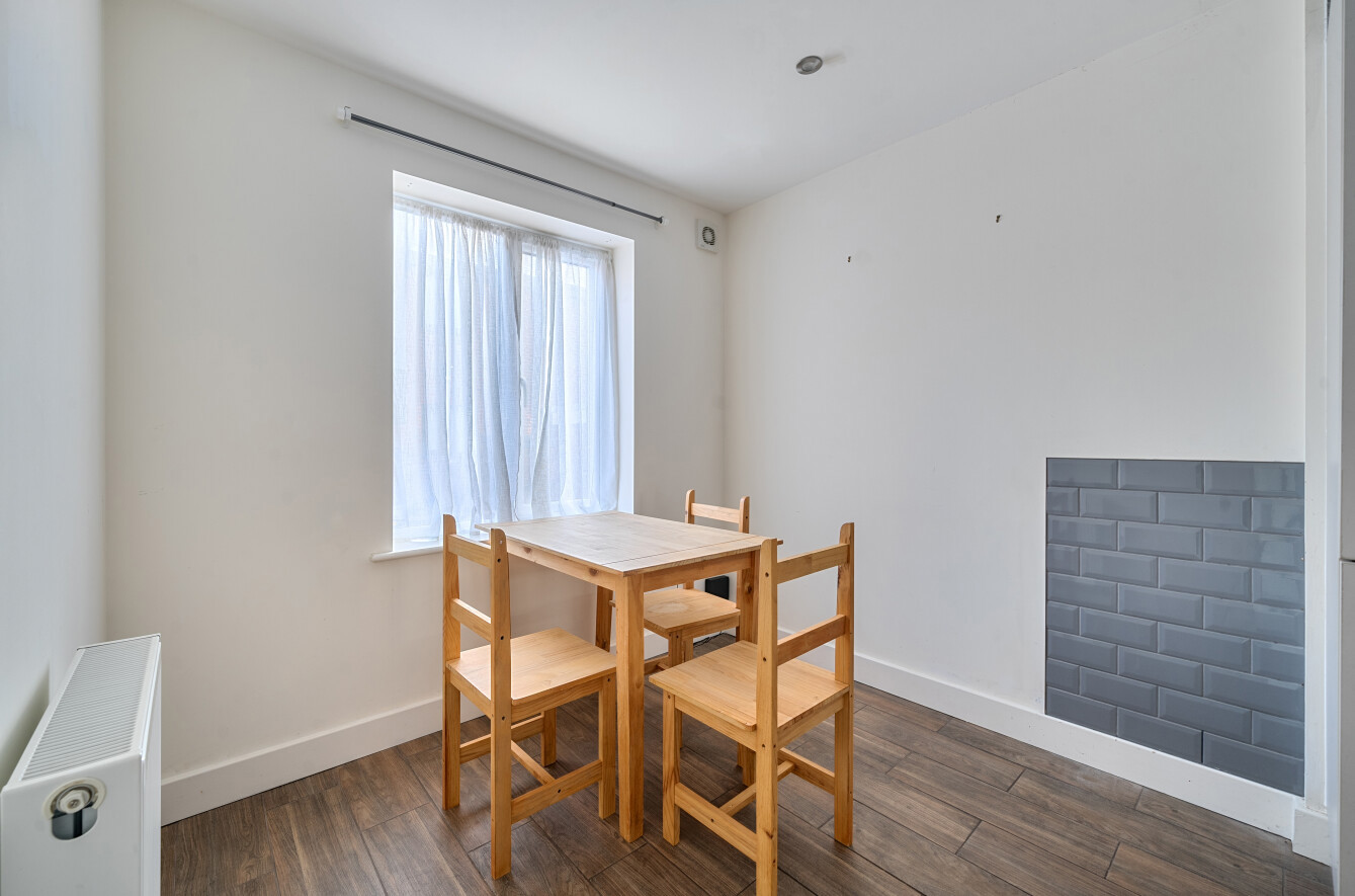 To the front of the home is a spacious kitchen/dining room, with the dining area flooded with natural light from a large double-glazed window. The fitted kitchen provides a generous range of storage cupboards and incorporates a selection of integrated appliances, including an oven, hob, extractor fan and fridge/freezer, with additional space for a washer/dryer.