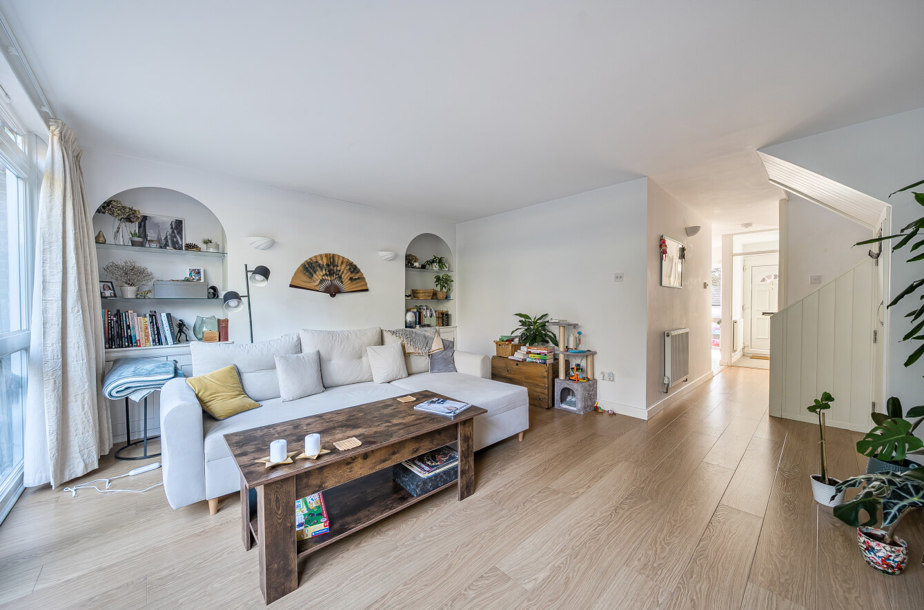 To the rear, the generous open-plan living room continues the bright and airy feel, enhanced by further full-height windows and attractive wooden flooring. French doors open directly onto the garden, seamlessly blending indoor and outdoor living.