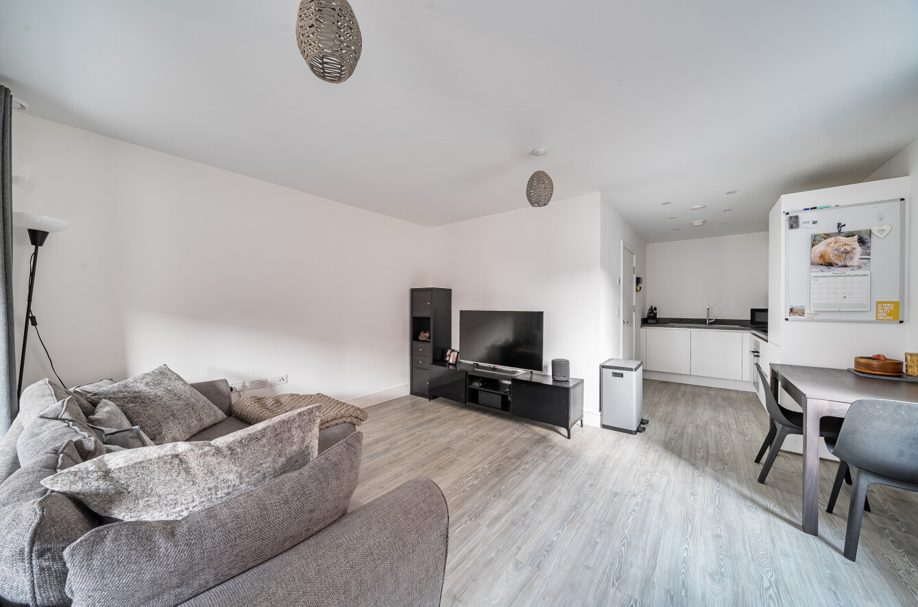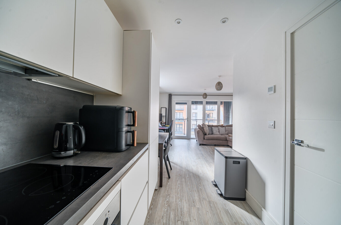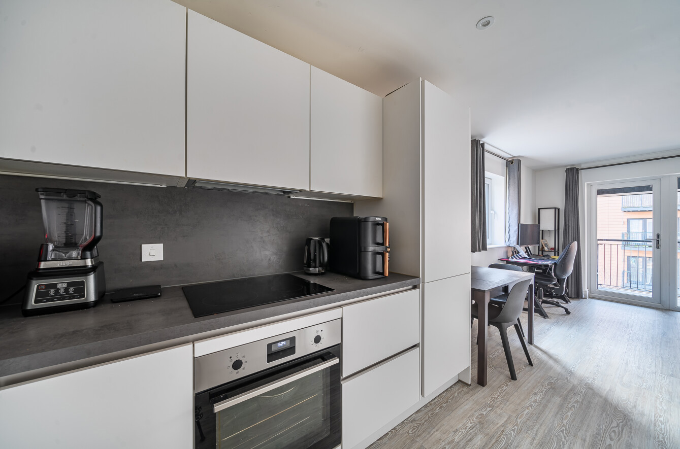 Adjacent to the living room is a modern fitted kitchen, boasting a range of fitted grey and white wall and base units with ceramic work surfaces and a range of integrated appliances.
