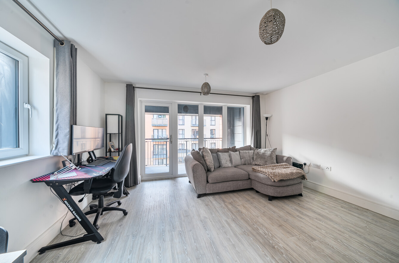 The open-plan living room offers the perfect space to relax or entertain and benefits from dual aspect windows and French doors to a spacious balcony with attractive views.