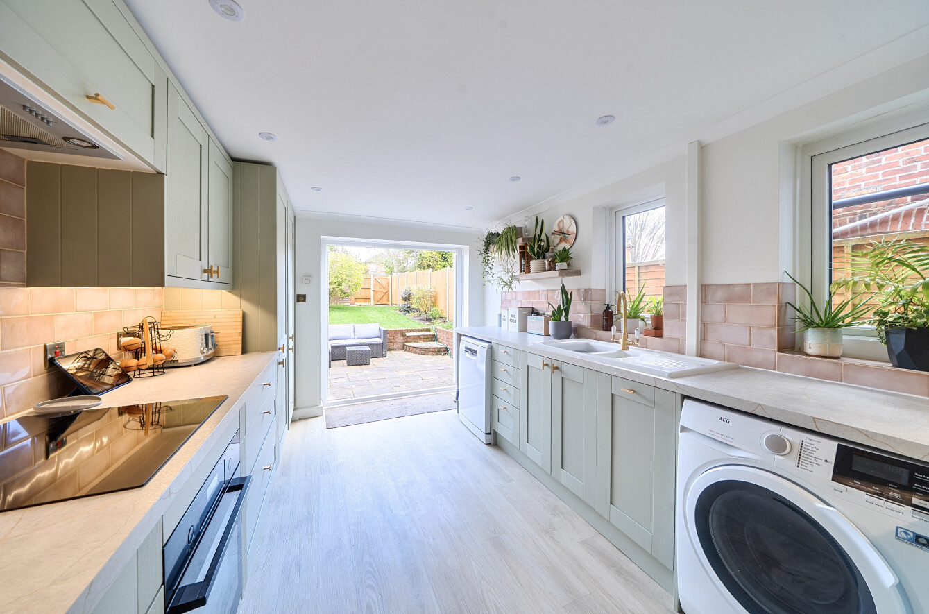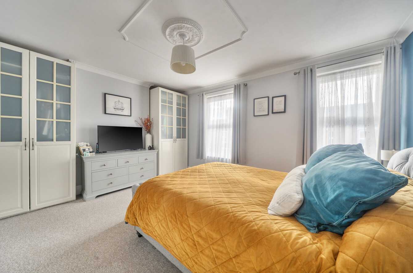 The ground floor accommodation is both stylish and well arranged, beginning with a welcoming entrance hallway with stairs rising to the first floor. This leads through to a bright and spacious dual-aspect open-plan sitting/dining room, featuring a bay window, stripped wooden floorboards, decorative cornicing, and an attractive open fireplace. To the rear, a sleek and modern kitchen overlooks the garden.