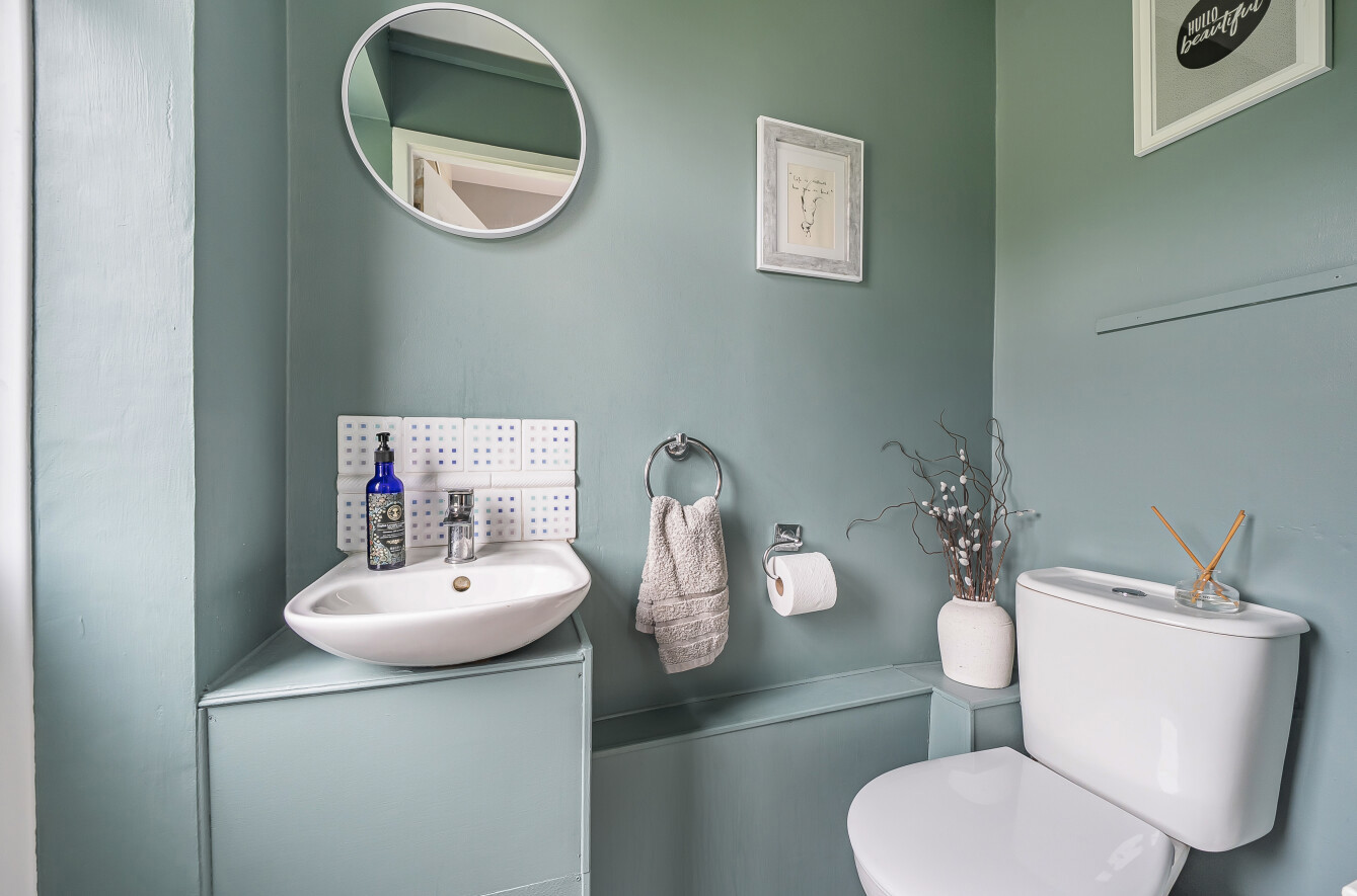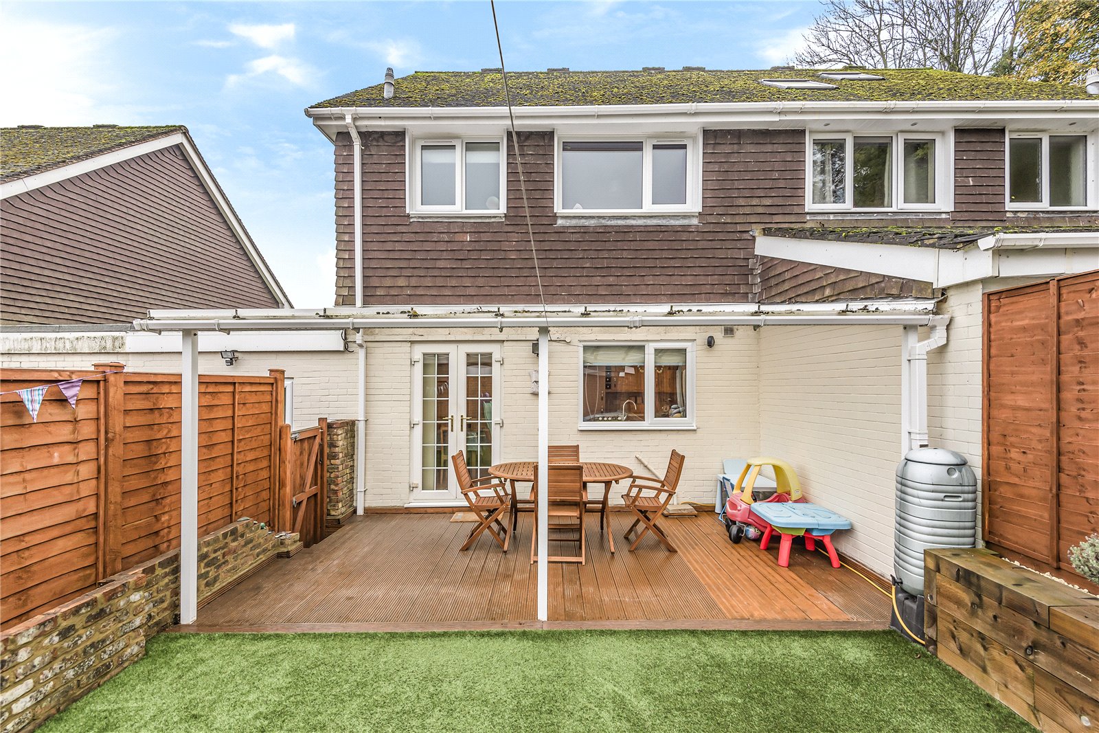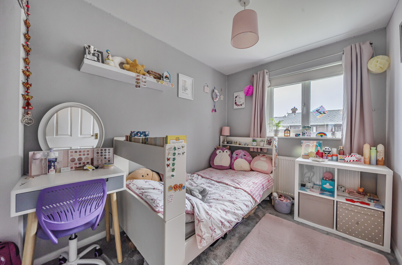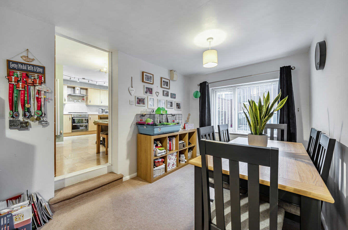 Upstairs on the first floor there are three well-proportioned bedrooms, the master with built-in wardrobes and bedroom three with a wardrobe area. A smart family bathroom with bath and shower over and two storage cupboards complete the first-floor accommodation. To the rear is a low maintenance garden with a good size decked area and the remainder is laid with artificial lawn. Side gated access leads to an allocated parking space.