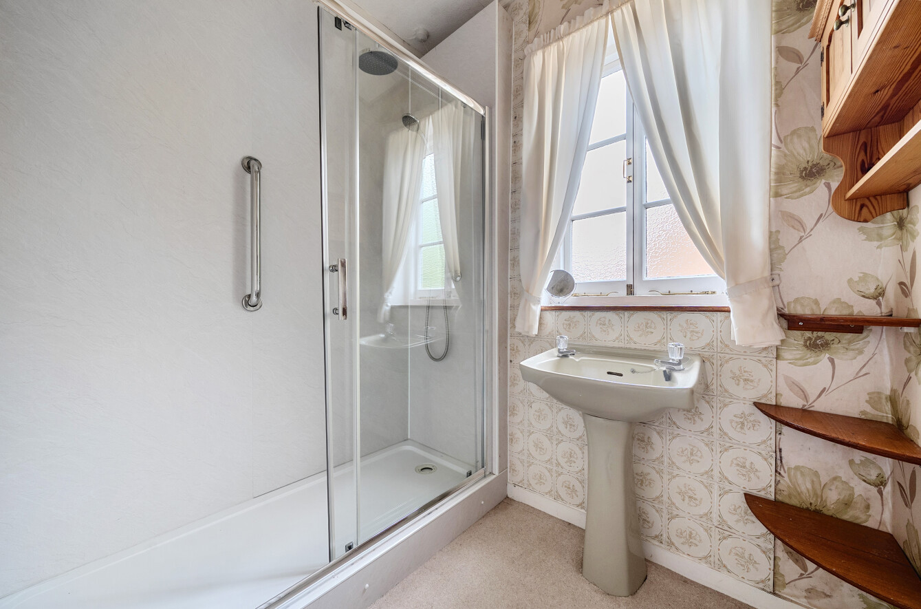 Upstairs are four well-proportioned bedrooms, two with built-in wardrobes. A modern shower room with large walk-in shower and hand basin serves all rooms, with a separate WC adjacent.