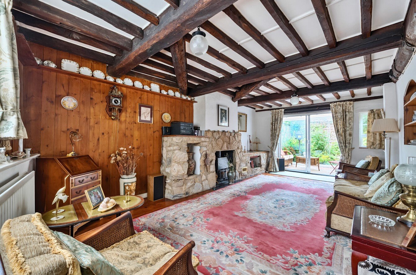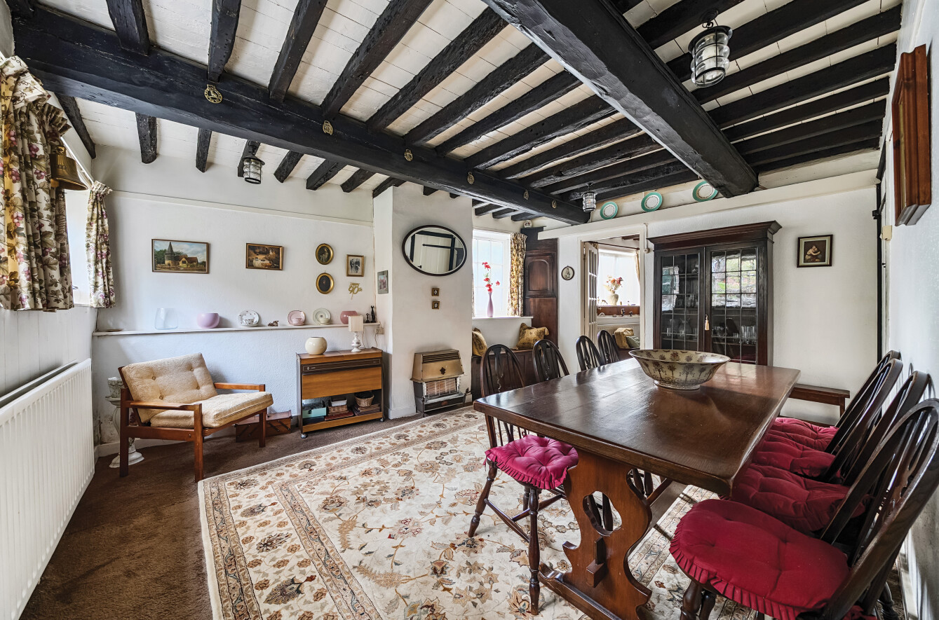 Entered via a useful enclosed porch, the ground floor opens into a welcoming hallway. To the left is a generous, dual-aspect dining room featuring original exposed beams and a beautiful oak window seat. Beyond lies a large, characterful sitting room with a beamed ceiling, an attractive fireplace with log burner, and sliding doors opening to a bright conservatory with access to the garden.