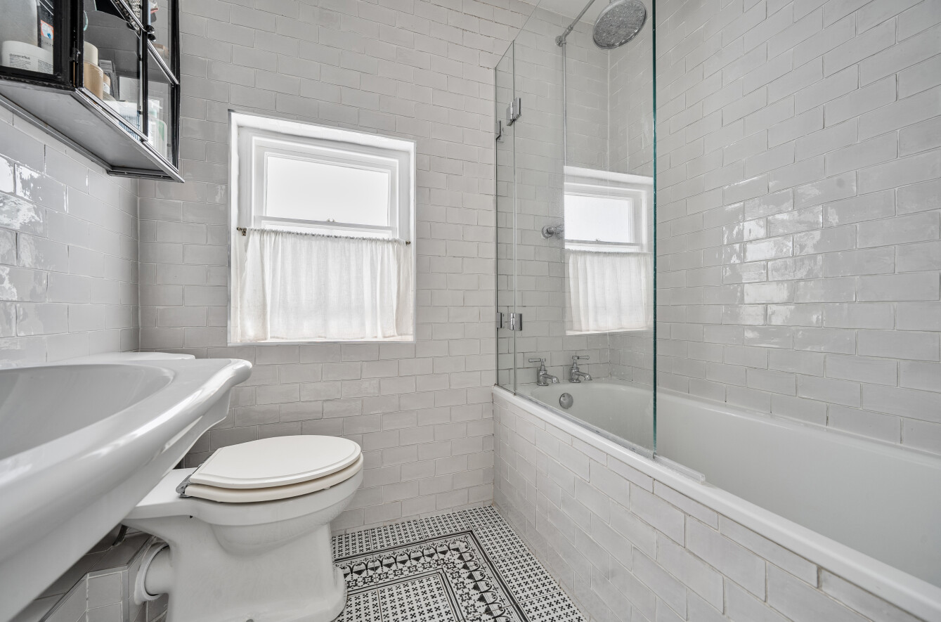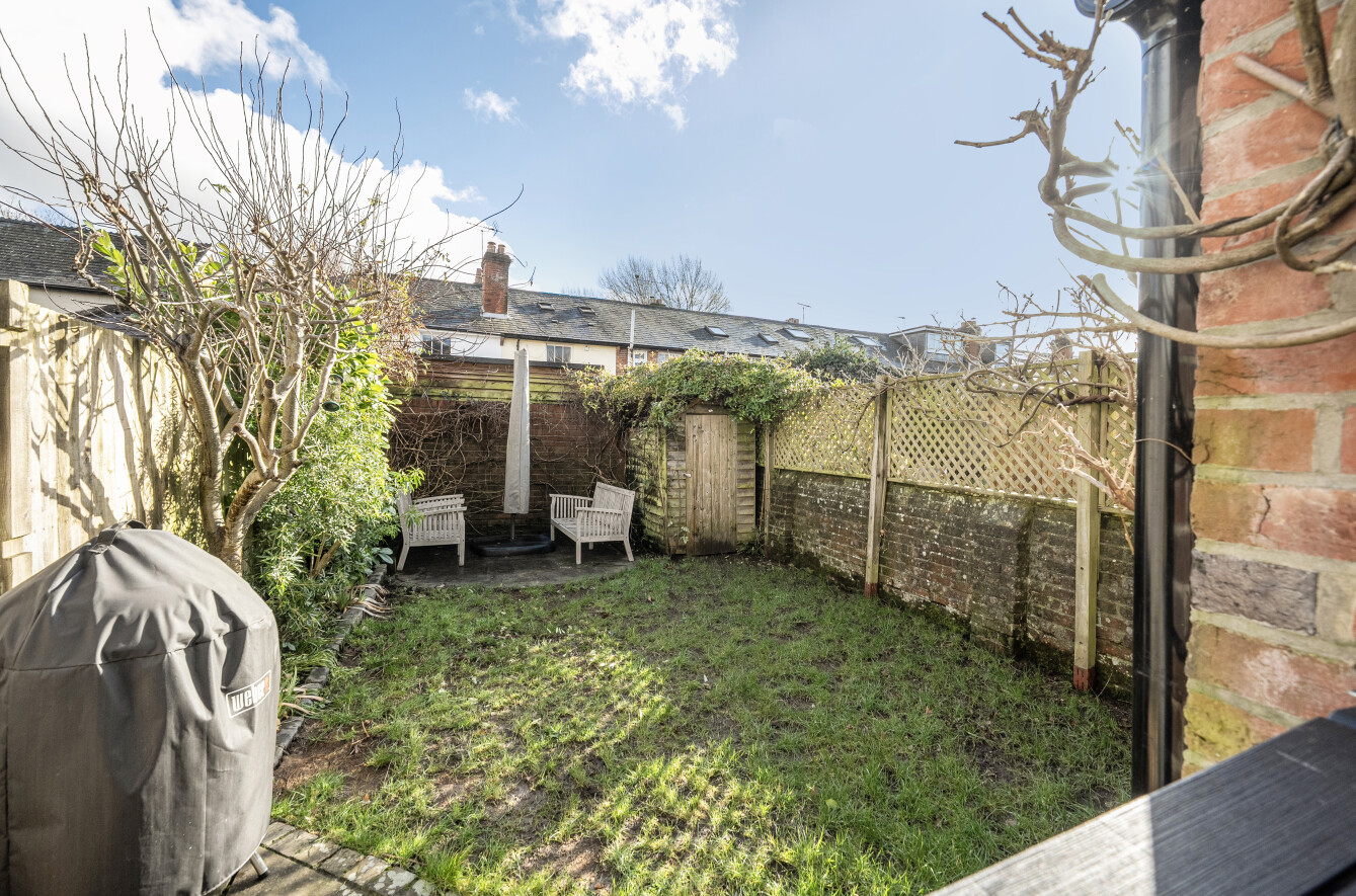 Upstairs, the principal bedroom is light-filled and features polished floorboards, a period fireplace, and fitted wardrobes. A second double bedroom overlooks the rear garden and includes a fireplace, fitted shelving, and picture rail, while a third bedroom makes an ideal single room or study. The modern family bathroom is fitted with a panelled bath with shower over, WC, and basin.