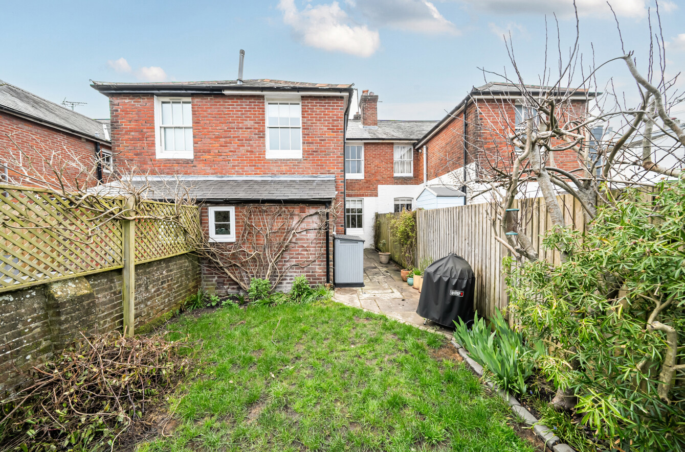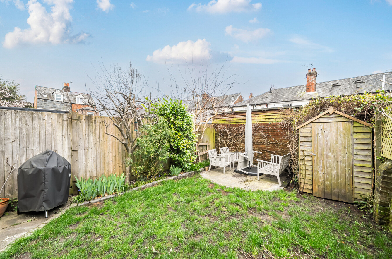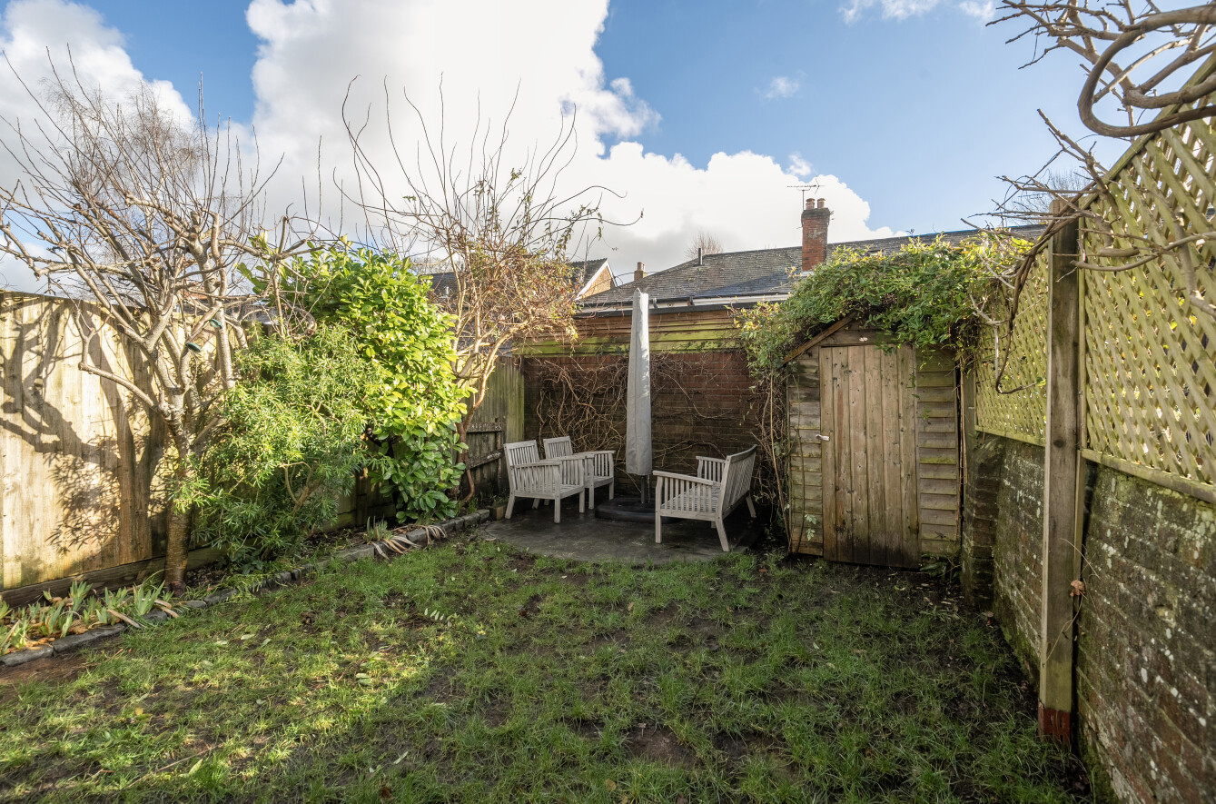 The rear garden is a true haven, with a terrace leading onto a lawn bordered by flowers and shrubs. A stunning wisteria frames the rear elevation, while an additional patio and storage shed provide practical outdoor space.