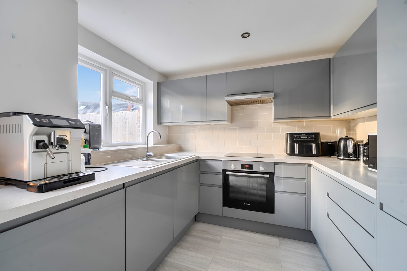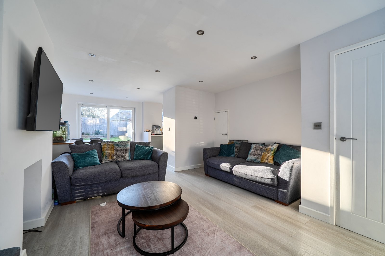 To the rear, the kitchen/dining room is a real standout feature. It boasts a contemporary kitchen with integrated appliances, with the space opening seamlessly into the dining area—ideal for both everyday family life and entertaining guests.