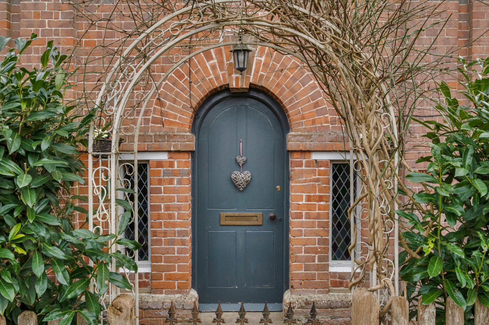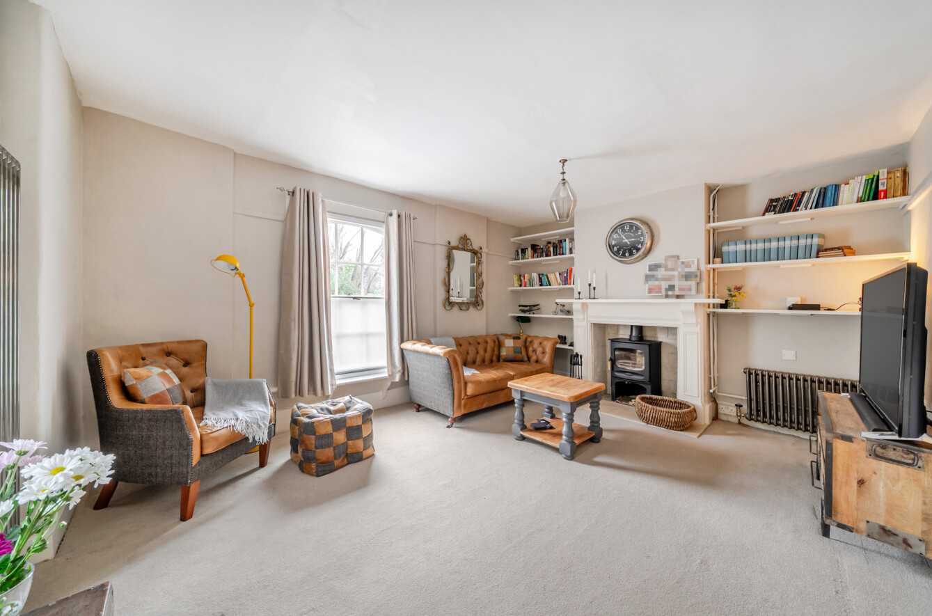 Approaching the property, you are welcomed by a charming rose-covered archway leading to an impressive arched front door, framed by elegant leaded light windows. The spacious sitting room at the front of the house is filled with natural light and features recessed shelving and a cosy log burner, creating a warm and inviting focal point.