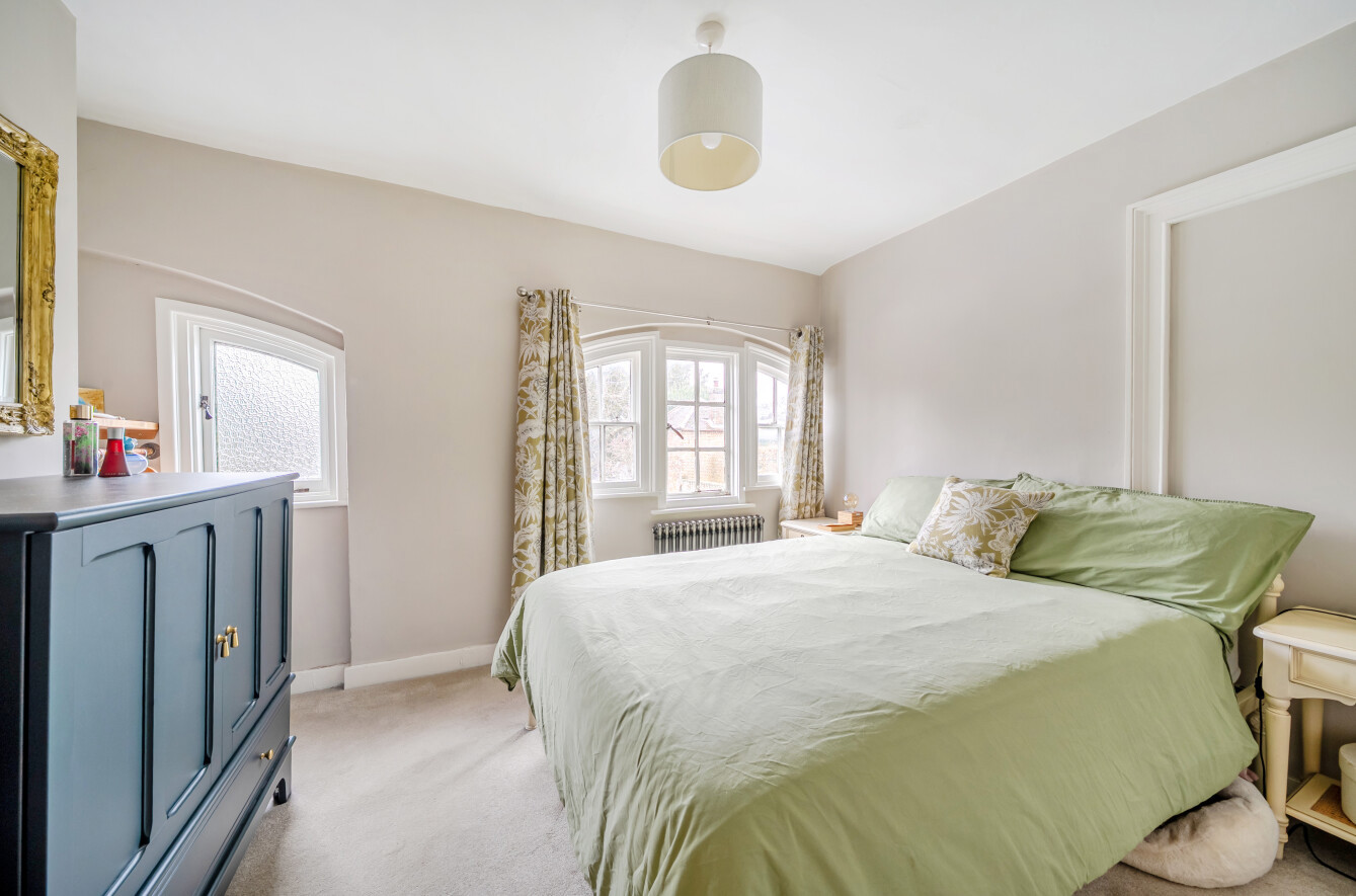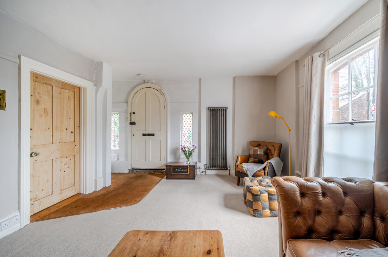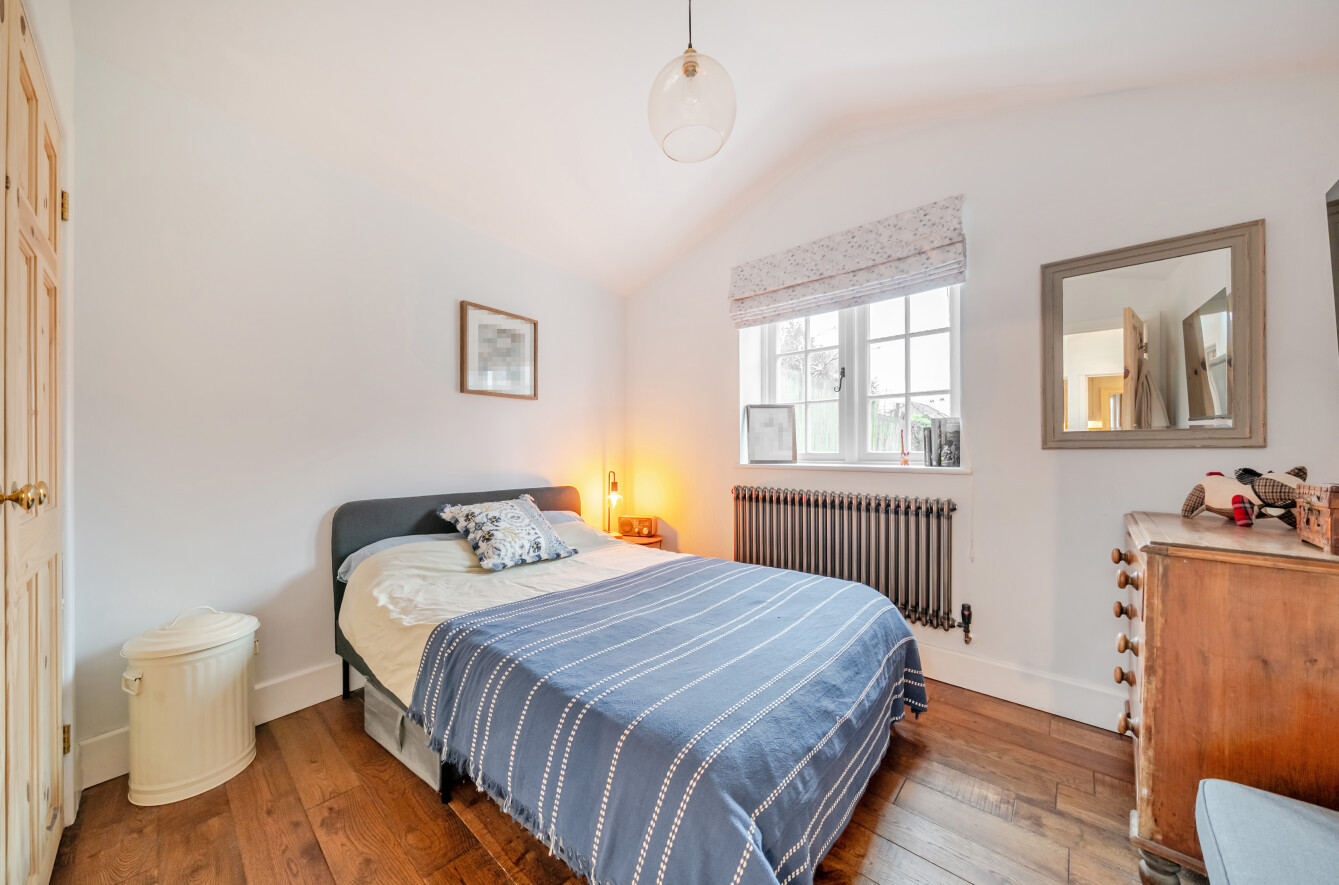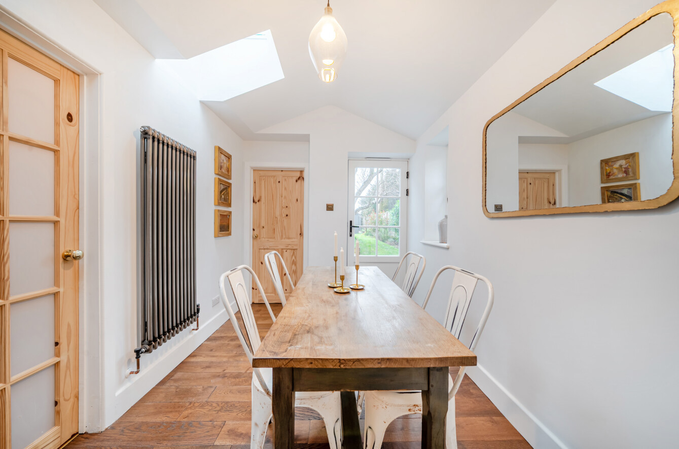 Upstairs, the owners have cleverly reconfigured the space to create two well-proportioned bedrooms and a spacious shower room. The principal bedroom is particularly charming, featuring curved windows and traditional-style radiators, which have been installed throughout the home to complement its period character. The second bedroom enjoys pleasant views over the front of the property and the surrounding village.