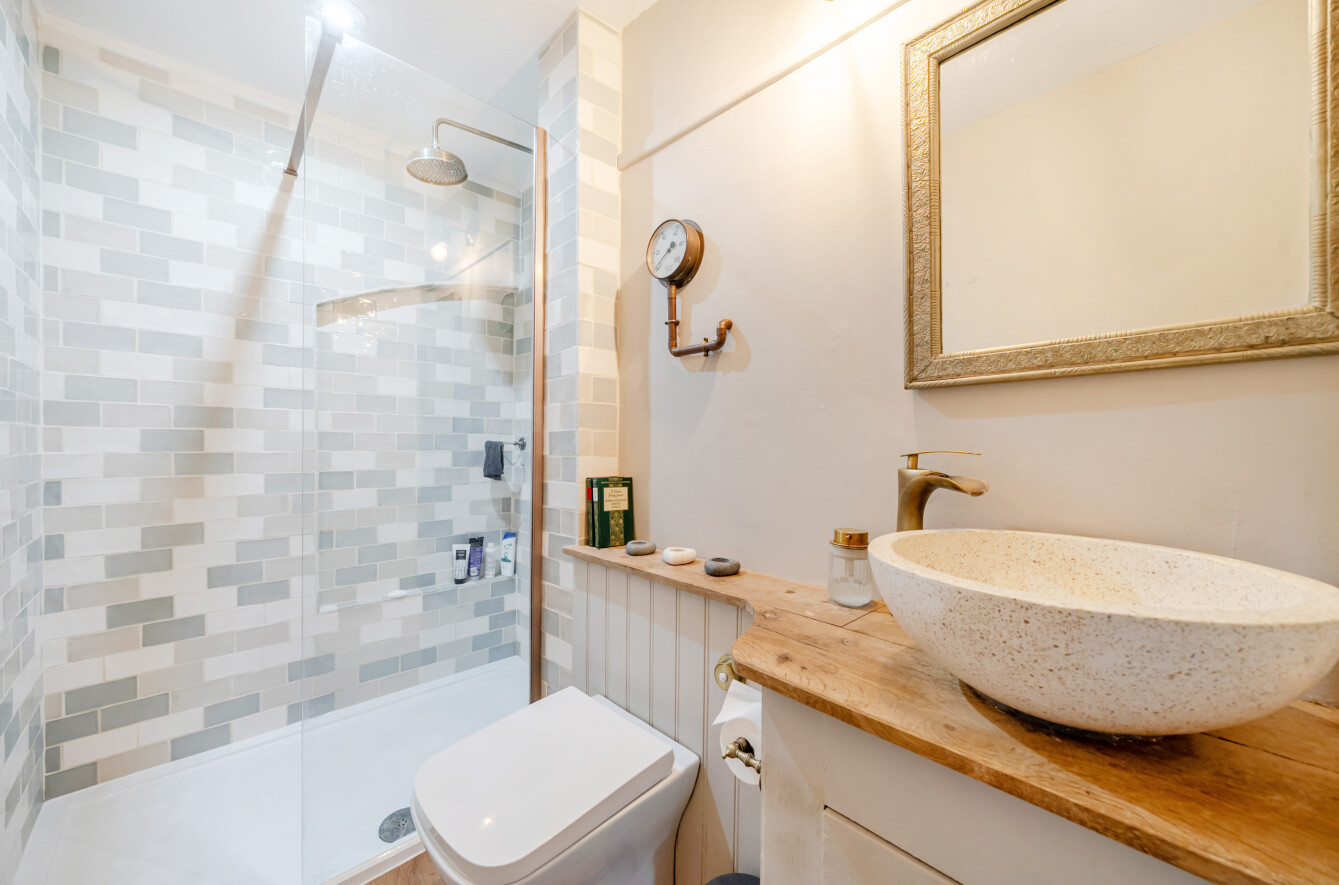 The newly redesigned shower room has been finished to a high standard and includes a walk-in shower with recessed shelving, a stylish standalone basin, and additional storage beneath.