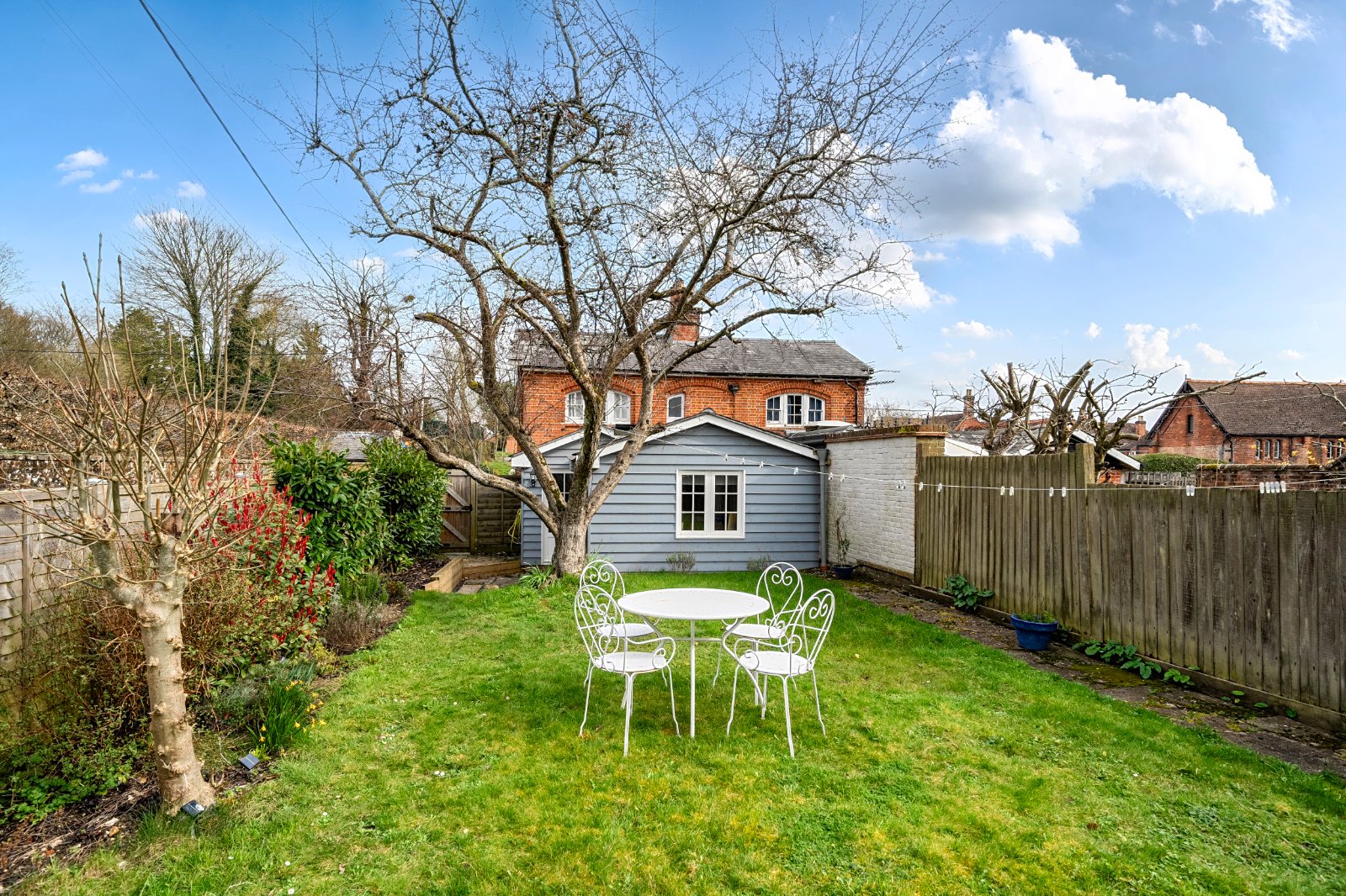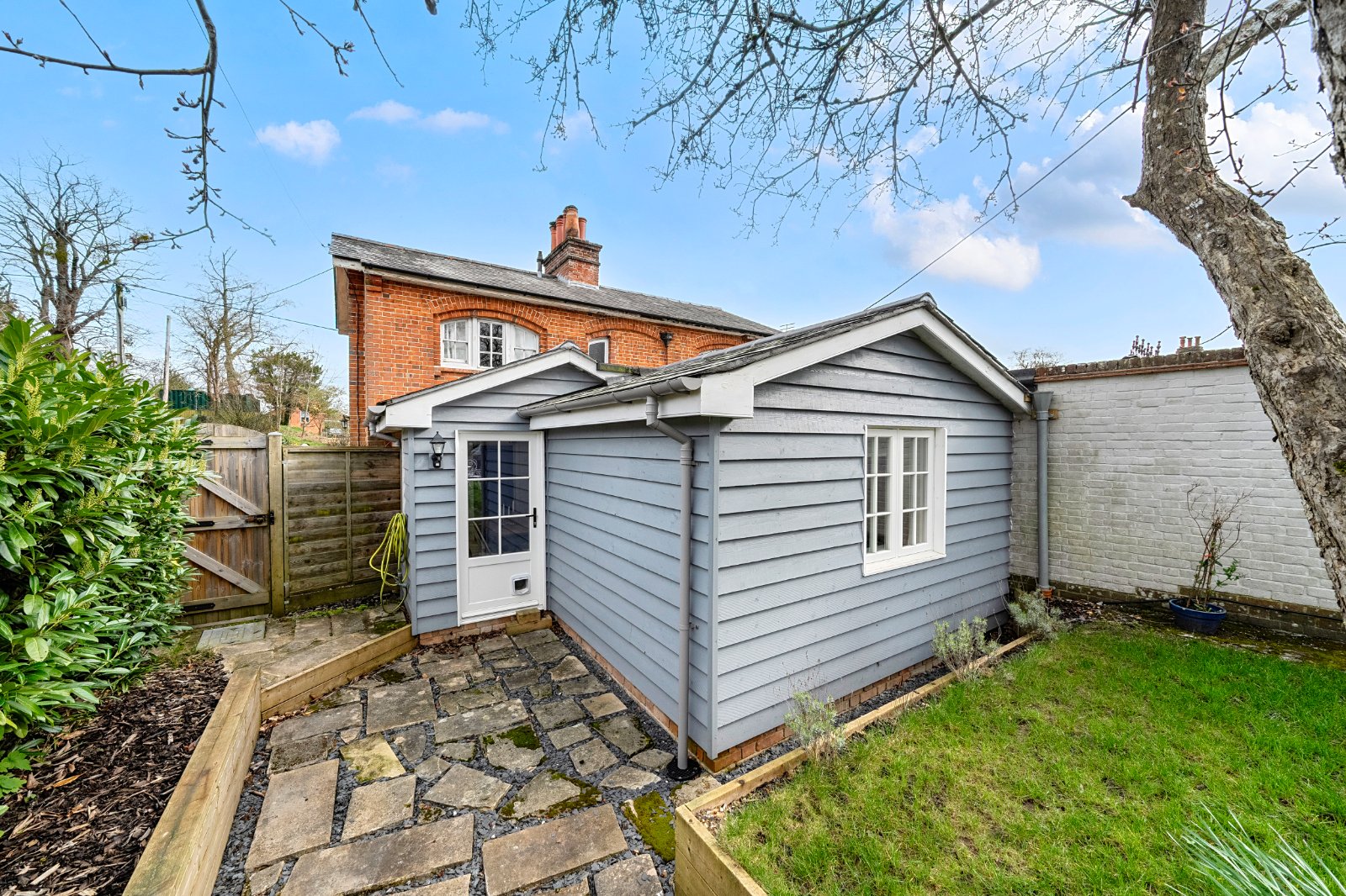 The south-westerly aspect ensures the garden enjoys plenty of afternoon sun, with a private patio area ideal for relaxing or entertaining. At the end of the garden is a useful home office, perfect for those working remotely, and there is space for an additional small shed should further storage be required.