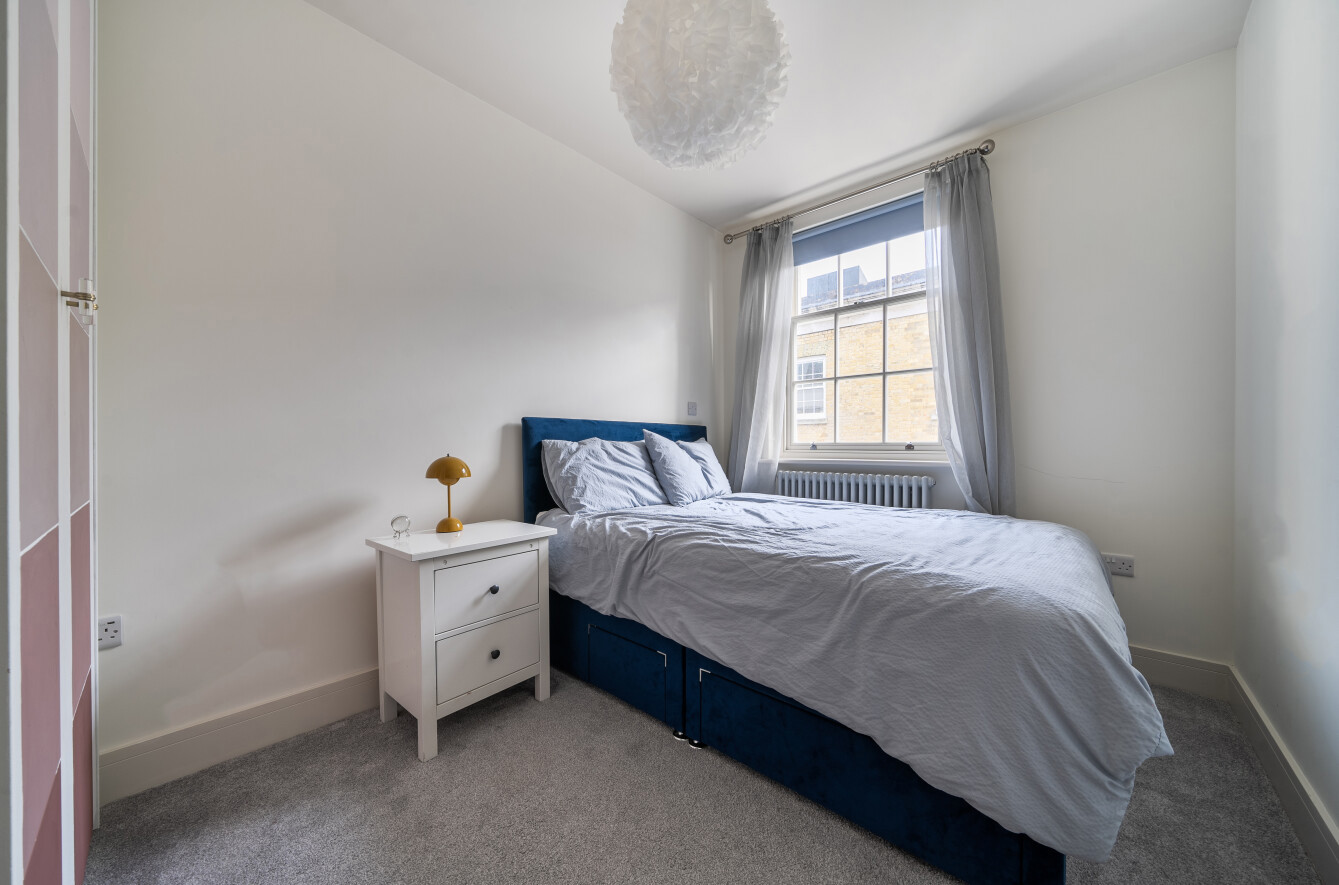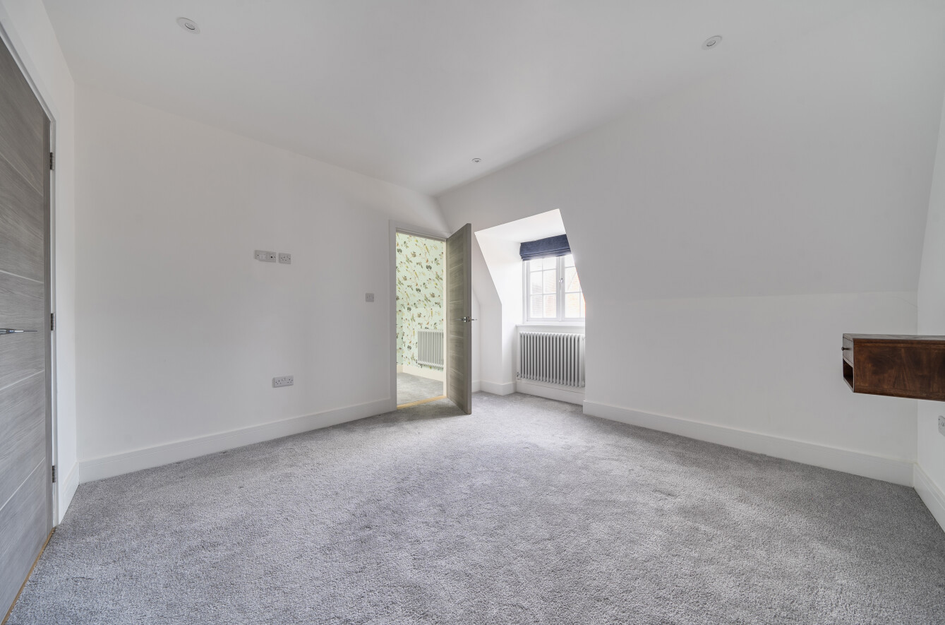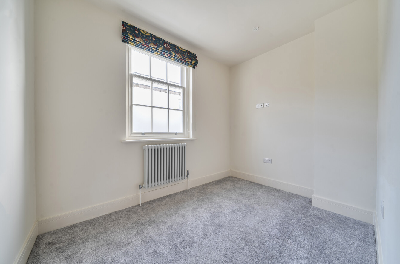 Rising to the second floor, the principal bedroom enjoys far-reaching views over attractive period properties. The room is well appointed with a substantial built-in wardrobe, media points, and USB sockets. The en suite bathroom is finished to a high standard, complete with twin vanity units, backlit mirror, a large walk-in shower, and a contemporary slim-profile heated towel rail.