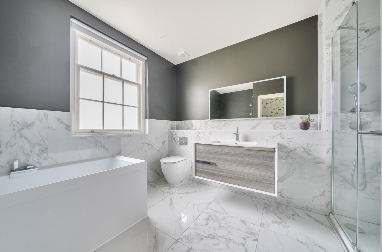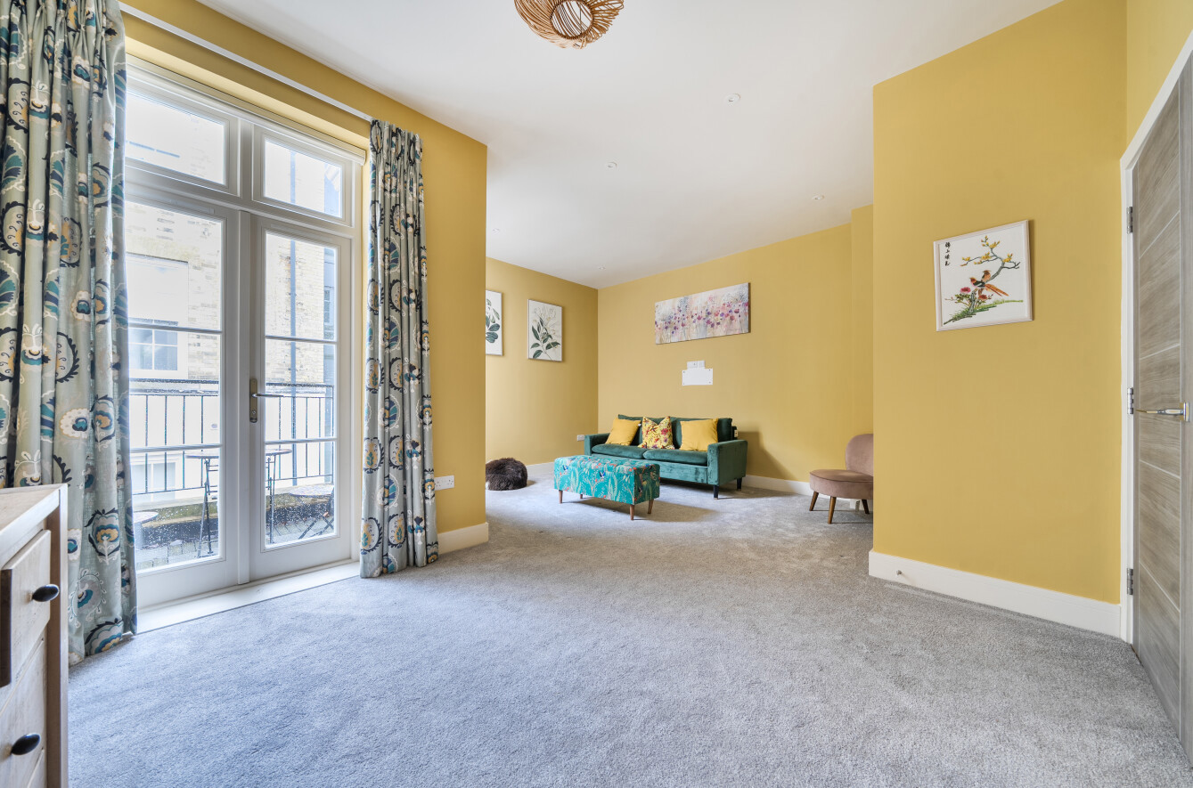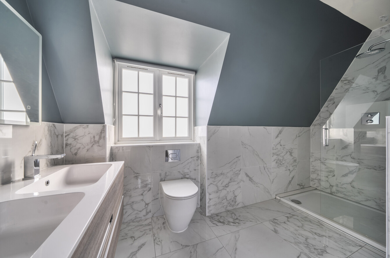 Rising to the second floor, the principal bedroom enjoys far-reaching views over attractive period properties. The room is well appointed with a substantial built-in wardrobe, media points, and USB sockets. The en suite bathroom is finished to a high standard, complete with twin vanity units, backlit mirror, a large walk-in shower, and a contemporary slim-profile heated towel rail.