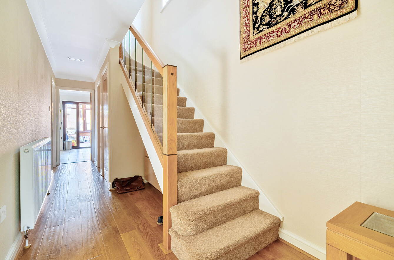 Upstairs, the property continues to impress with three generously sized double bedrooms, all served by a modern family bathroom. Externally the well-maintained garden features both patio and lawn areas, a log store, and convenient side access and direct access to the single garage.
