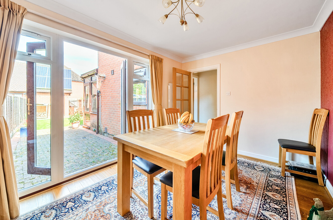 This lovely property features a delightful front garden and offers the convenience of a single garage located at the rear. Upon entering, the ground floor welcomes you with a cosy reception room, complete with a dual-sided log burner. Adjacent to the reception room, there is a separate dining room that also enjoys the warmth of the log burner, creating an ideal atmosphere for family meals, with French doors opening to the rear garden.