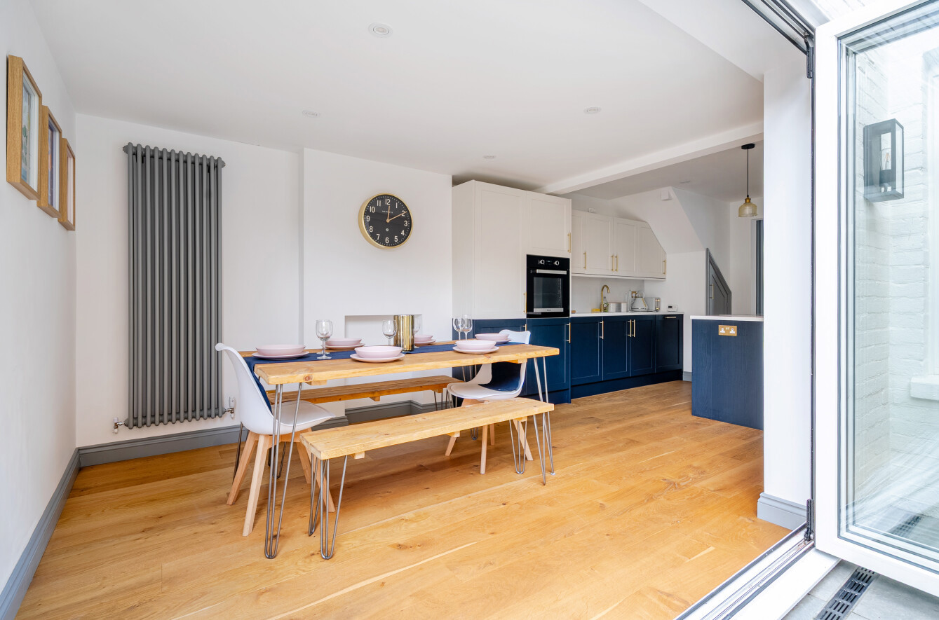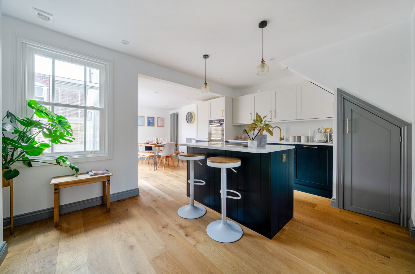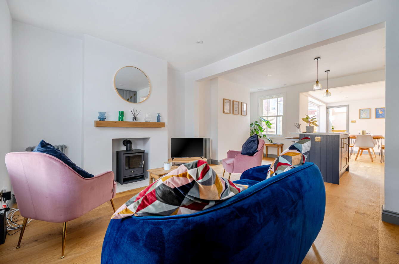 As you step inside, the open layout immediately creates a sense of space and flow through the ground floor. At the front, the living area exudes warmth and comfort, featuring a newly installed wood-burning stove—an inviting spot to relax. Centrally located is the sleek open-plan kitchen with a functional island, offering ample storage and counter space, complete with premium Miele appliances. Toward the rear, the dining area opens via large bifold doors to a sunny courtyard garden, perfect for alfresco dining and entertaining. A newly installed utility room and a convenient downstairs cloakroom complete the ground floor.