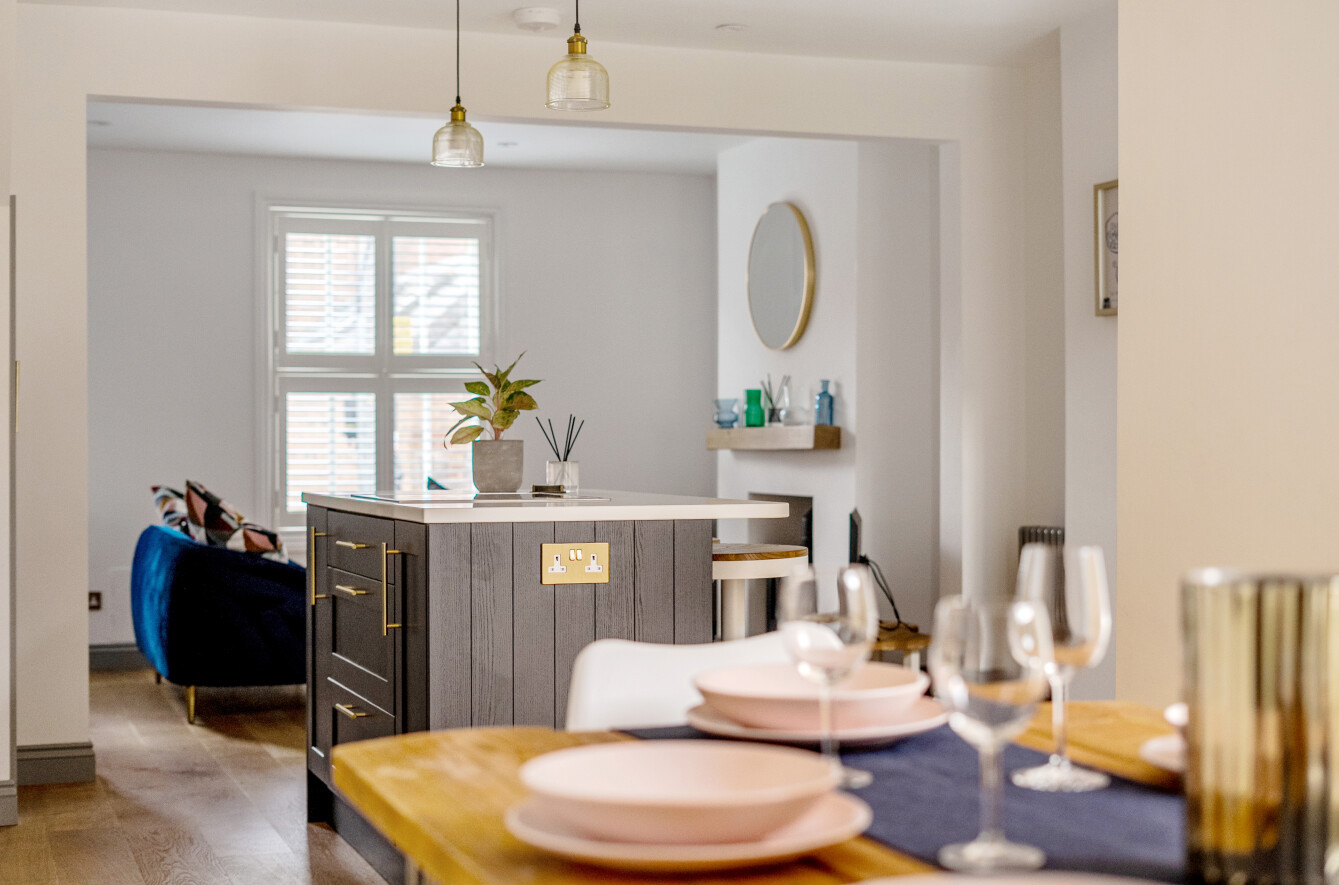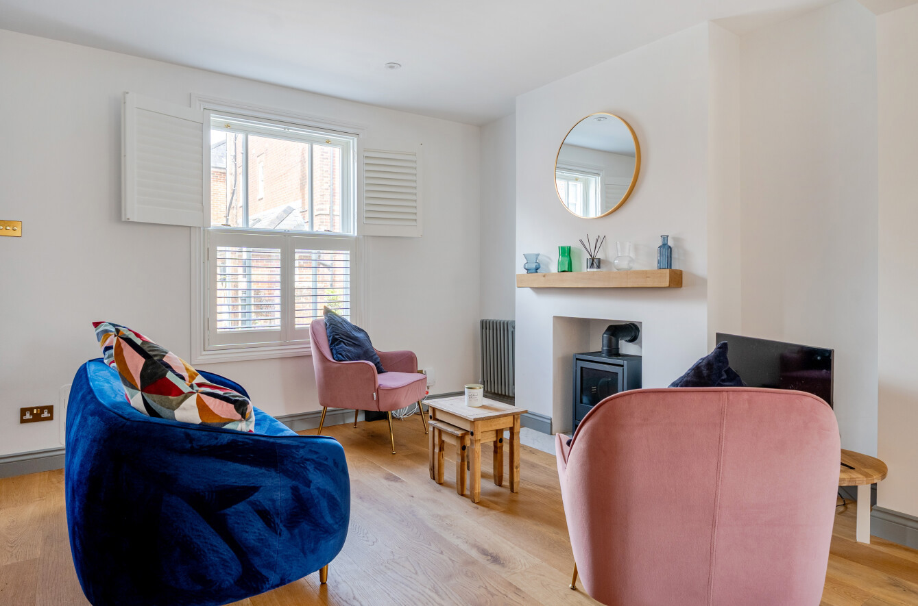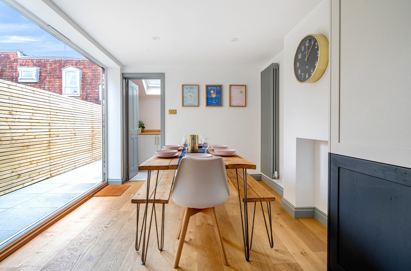 As you step inside, the open layout immediately creates a sense of space and flow through the ground floor. At the front, the living area exudes warmth and comfort, featuring a newly installed wood-burning stove—an inviting spot to relax. Centrally located is the sleek open-plan kitchen with a functional island, offering ample storage and counter space, complete with premium Miele appliances. Toward the rear, the dining area opens via large bifold doors to a sunny courtyard garden, perfect for alfresco dining and entertaining. A newly installed utility room and a convenient downstairs cloakroom complete the ground floor.