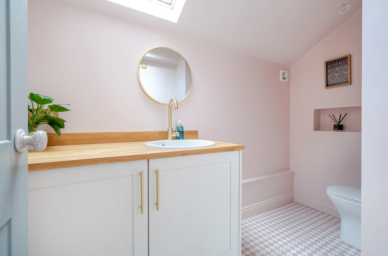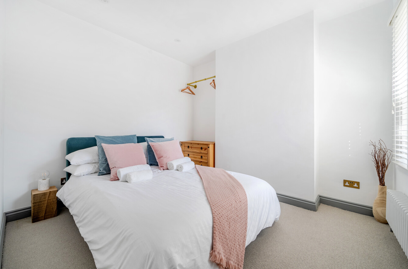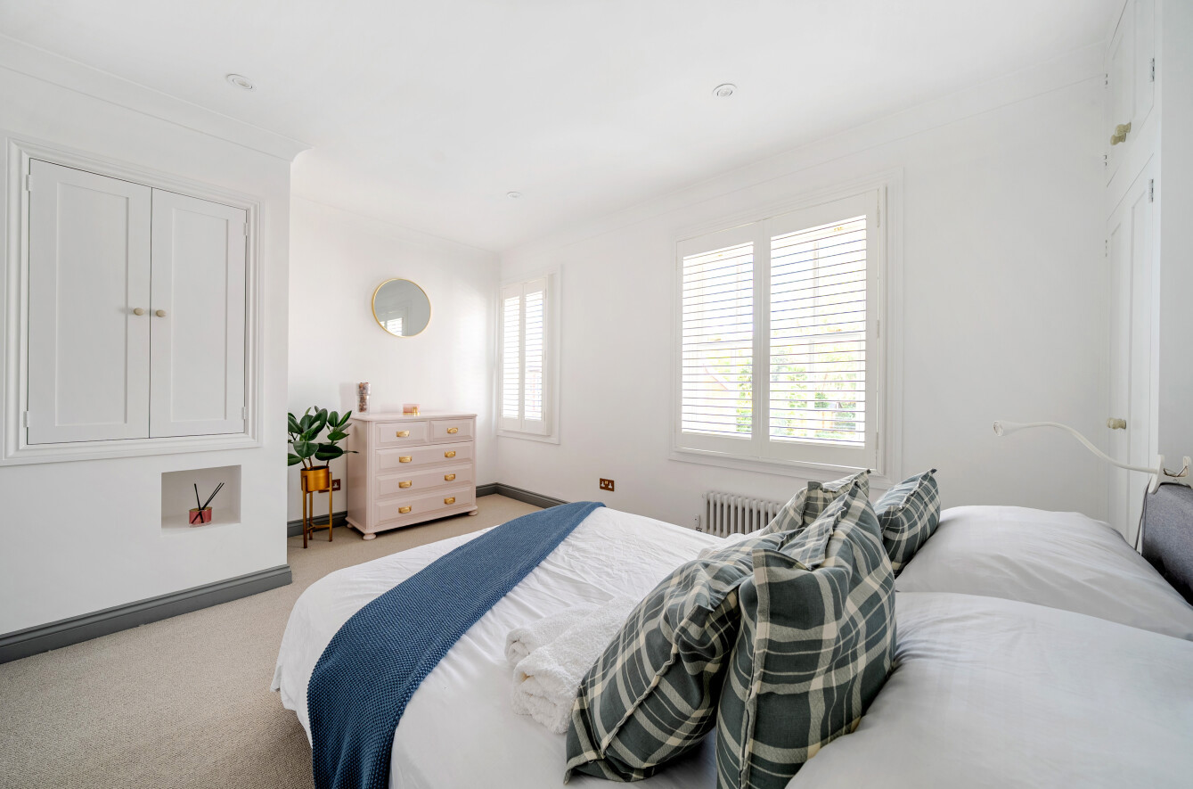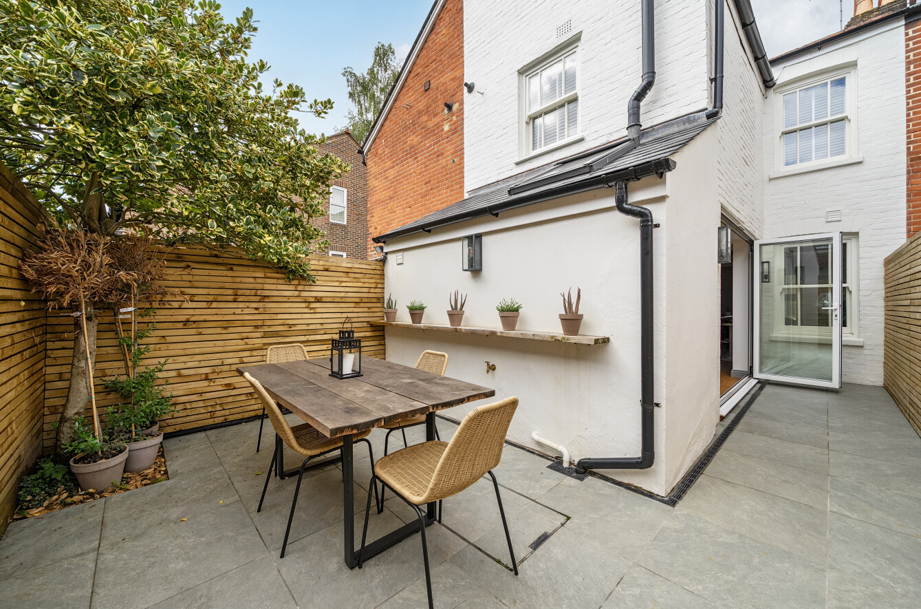 The first floor has been thoughtfully reconfigured, with a relocated staircase enhancing the practicality and creating additional space. At the rear, a third bedroom serves as a cozy single room or an ideal home office. The luxurious bathroom, centrally positioned, is beautifully designed with a spa-like feel. Toward the front of the house, two spacious double bedrooms feature stunning sash windows that flood the rooms with natural light.