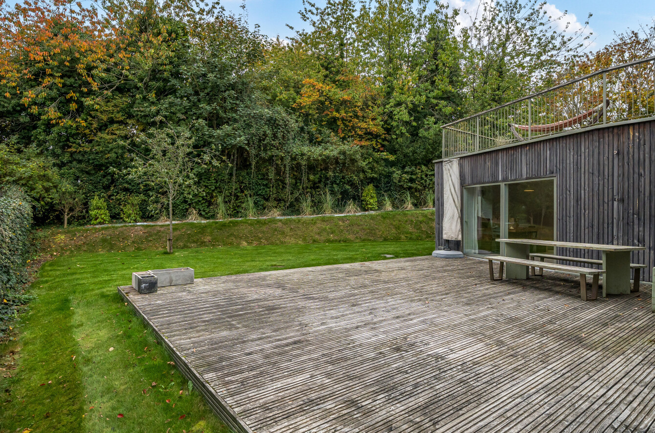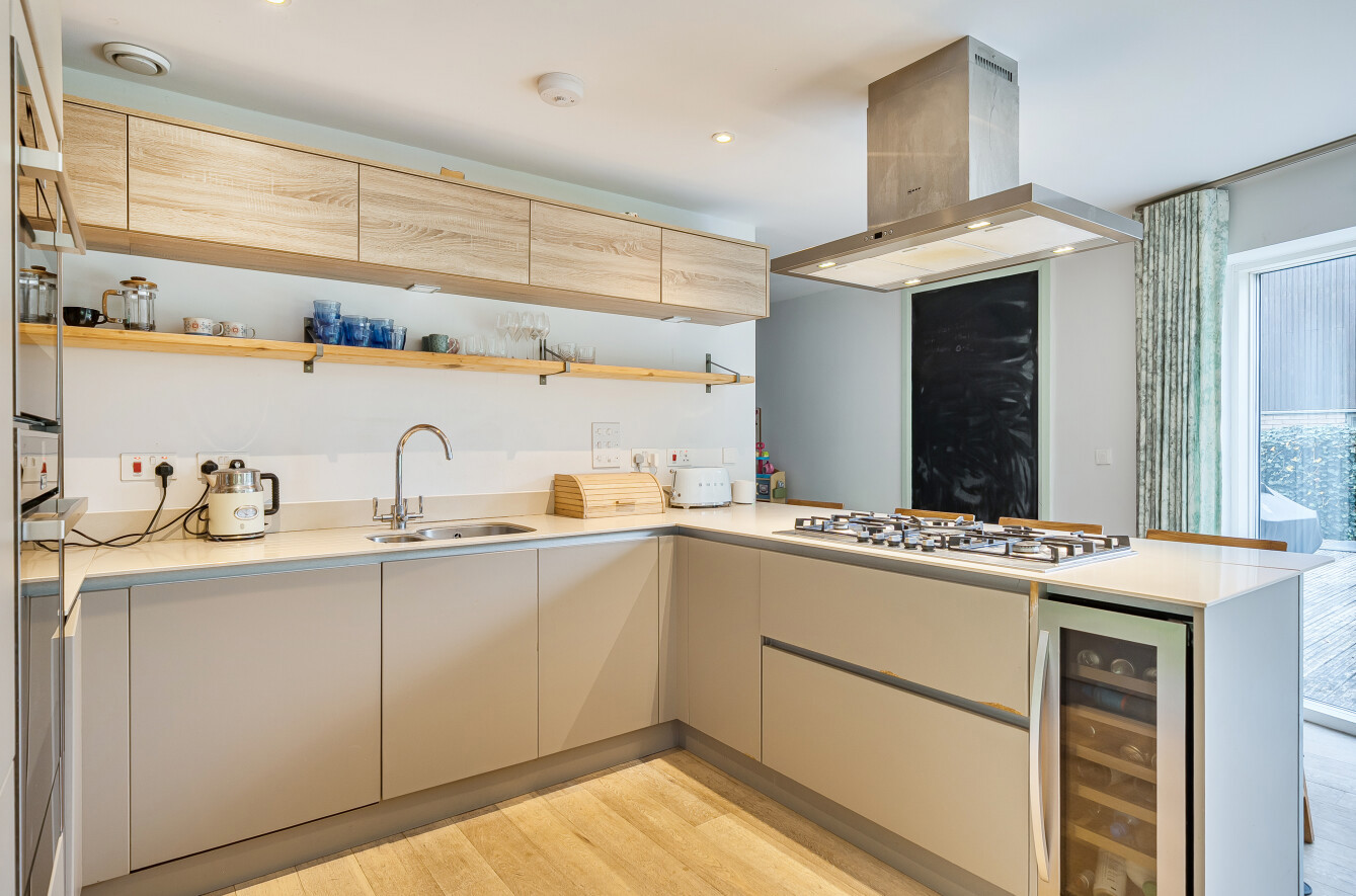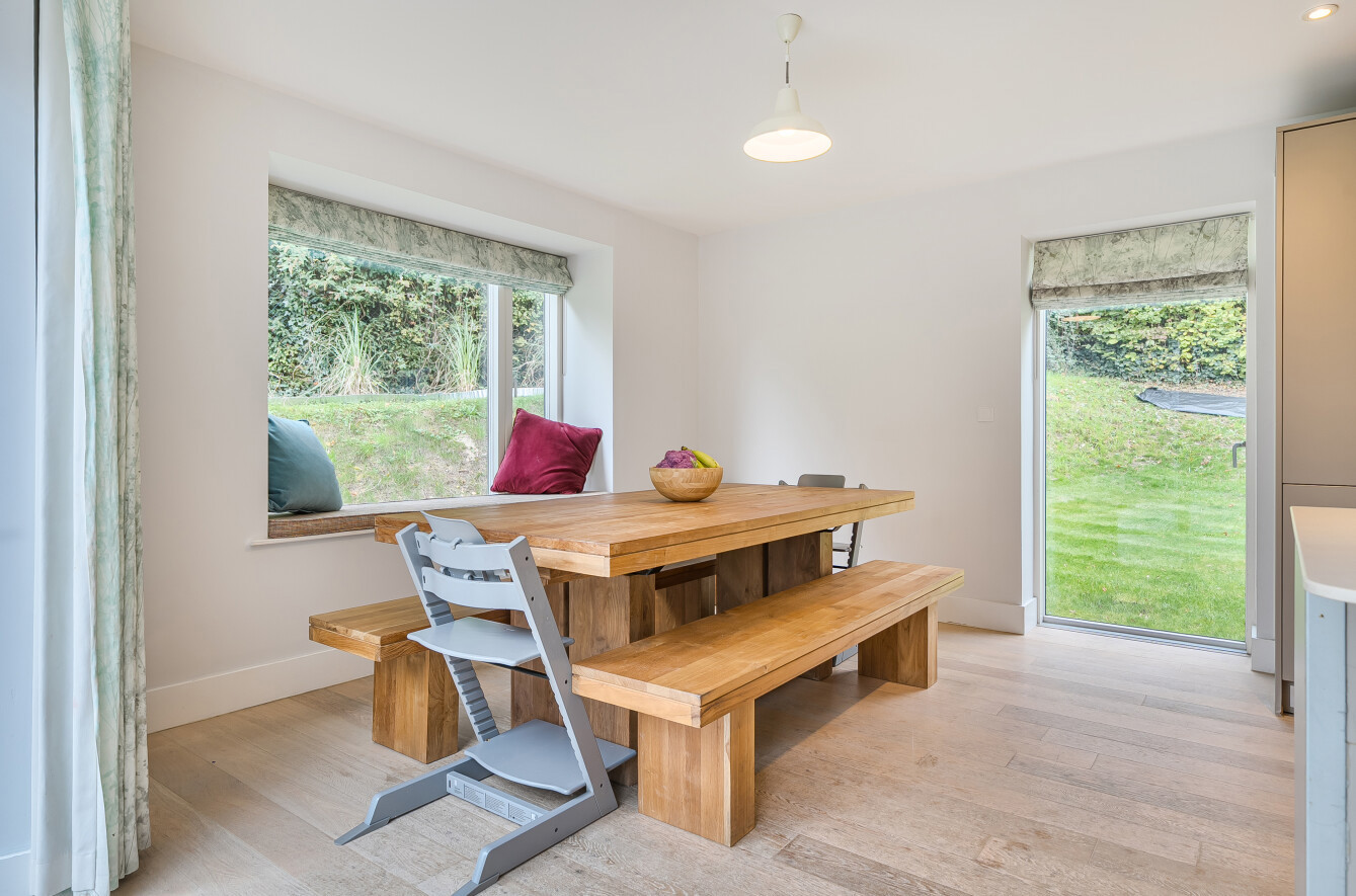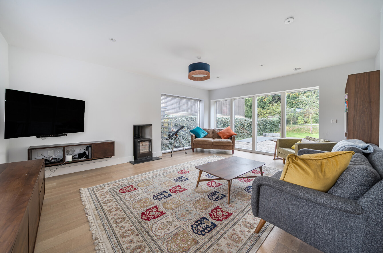 At the heart of the home lies a stunning open-plan kitchen and dining area, flooded with natural light through full-height glazing that opens directly onto a private garden and decked terrace — perfect for relaxed family living and entertaining. The bright sitting room offers a calm, welcoming atmosphere with wide sliding doors that connect seamlessly to the garden, while a versatile study or hobby room provides an ideal space for home working or creative pursuits.