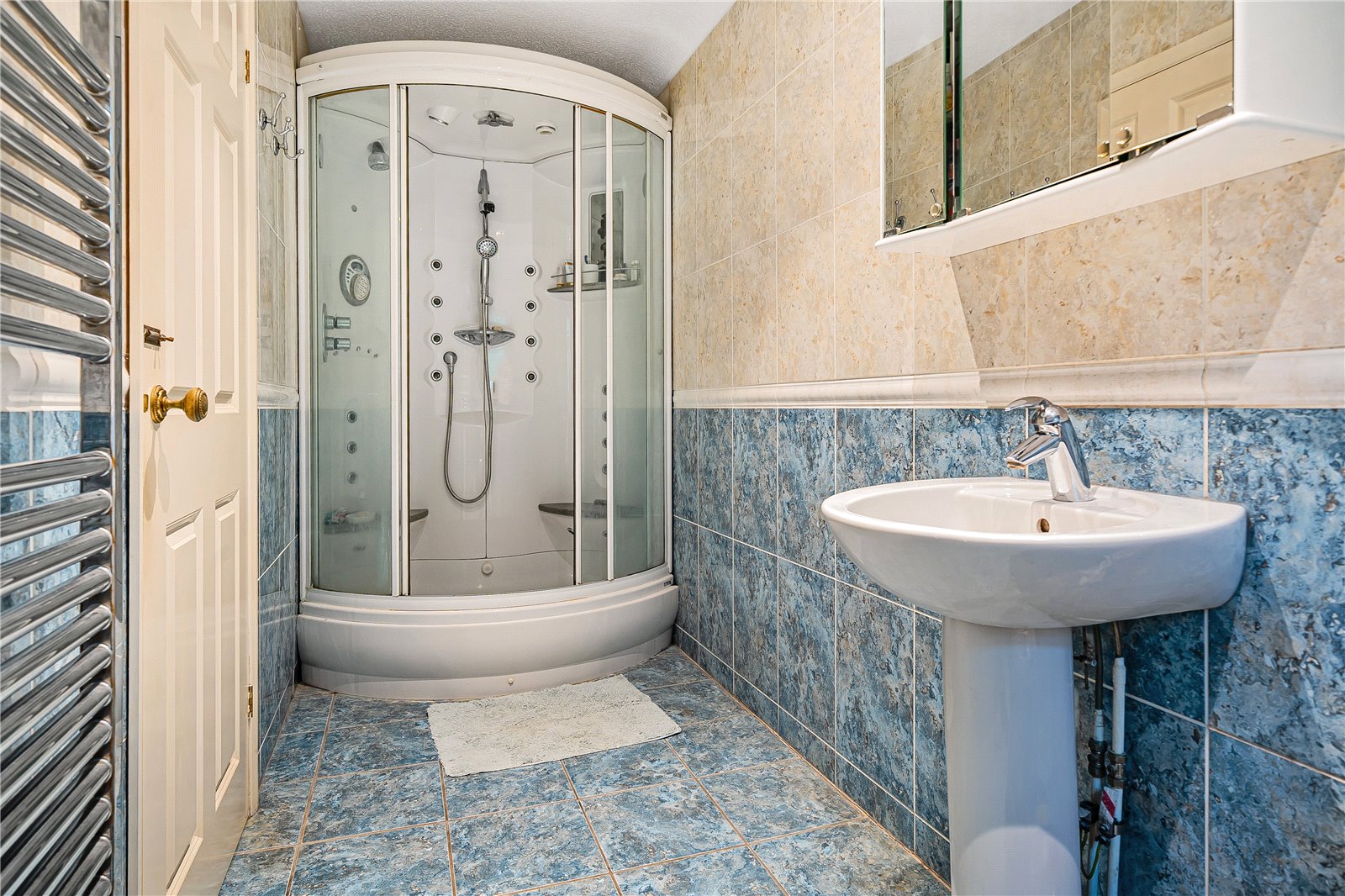 Upstairs, the property comprises six well-proportioned bedrooms, providing versatile space for family living or home office use. The principal bedroom boasts a large en-suite shower room and ample built-in storage, while the second bedroom also features its own en-suite and fitted wardrobes. The remaining bedrooms are served by a well-appointed family bathroom.