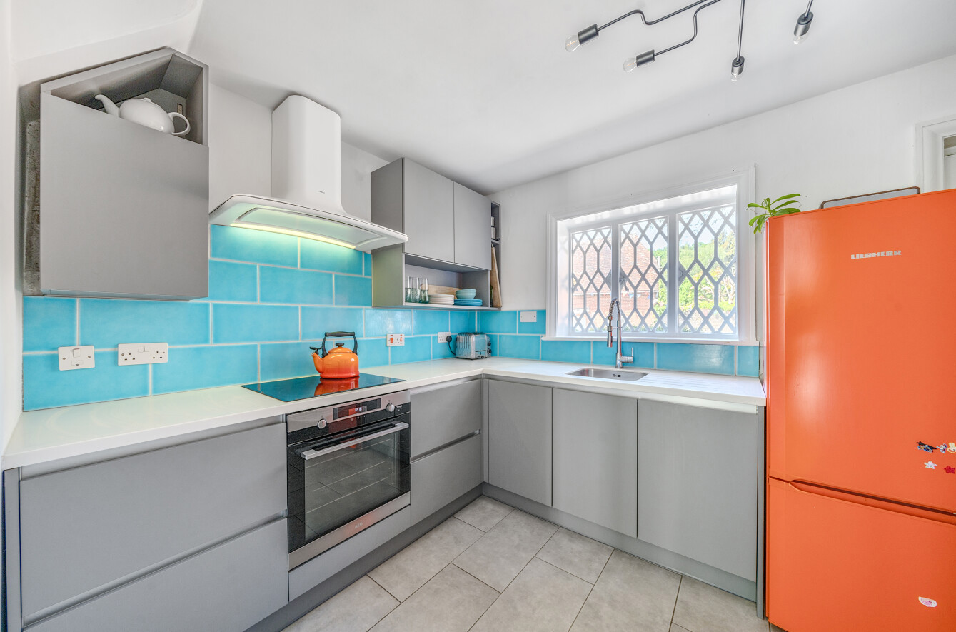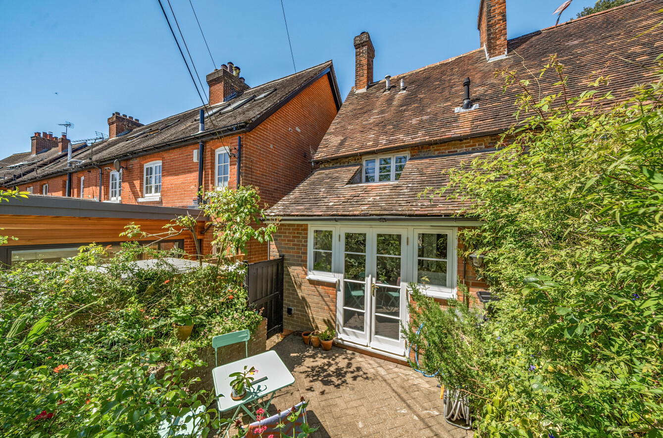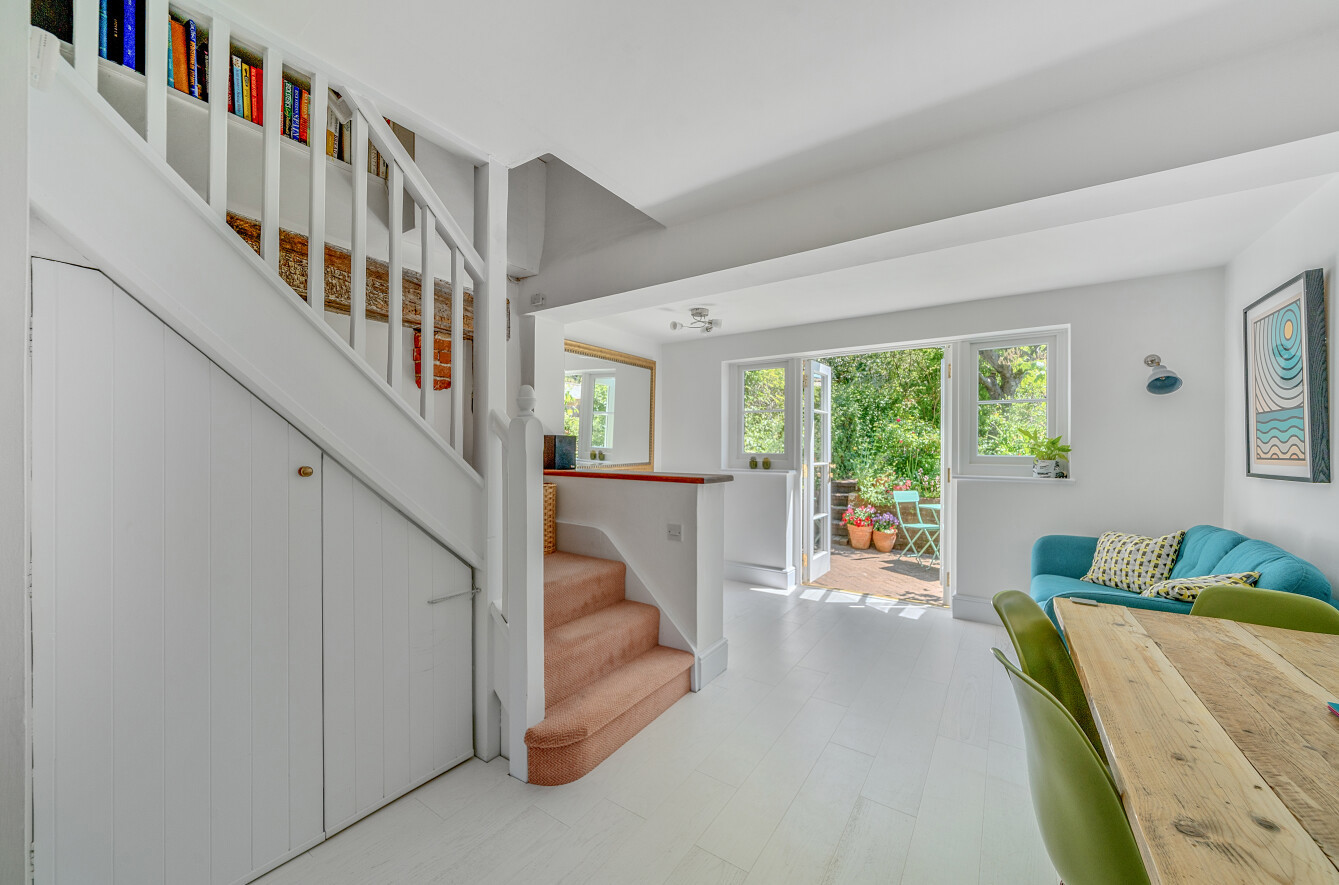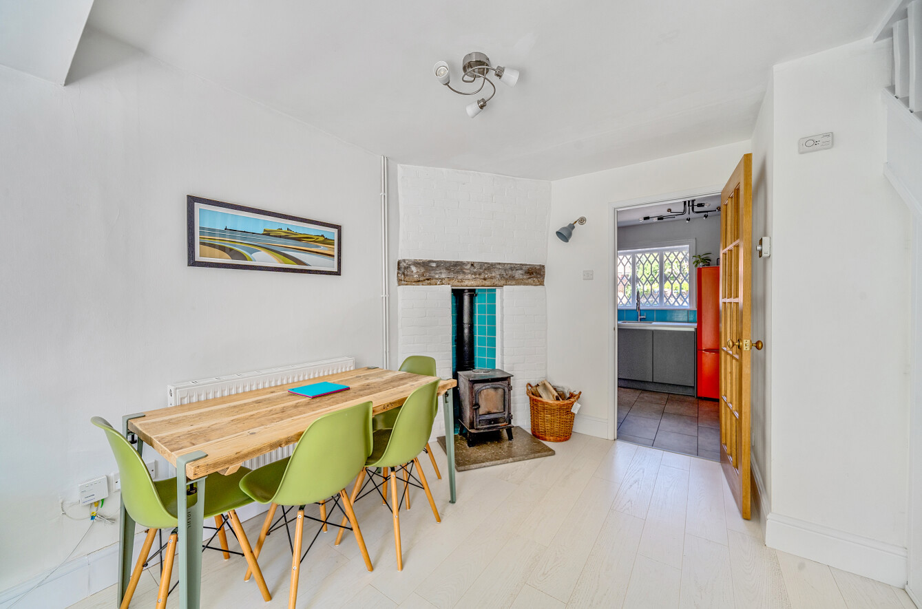 The ground floor features a compact sitting/dining room boasting exposed beams and natural light, leading through to a stylishly appointed kitchen and a functional bathroom. Upstairs, the first floor hosts two bedrooms. Bedroom one enjoys a bright aspect to the front, while bedroom two offers a cosy and peaceful retreat overlooking the rear garden, with a shower room serving the first floor.