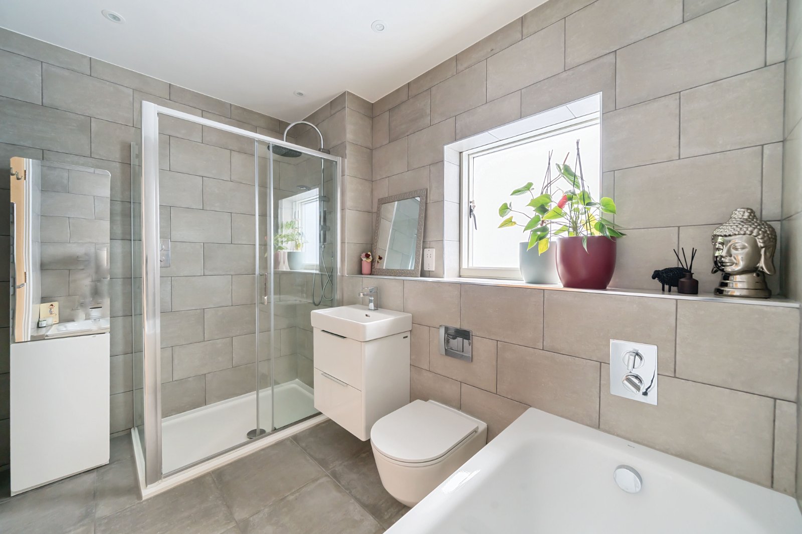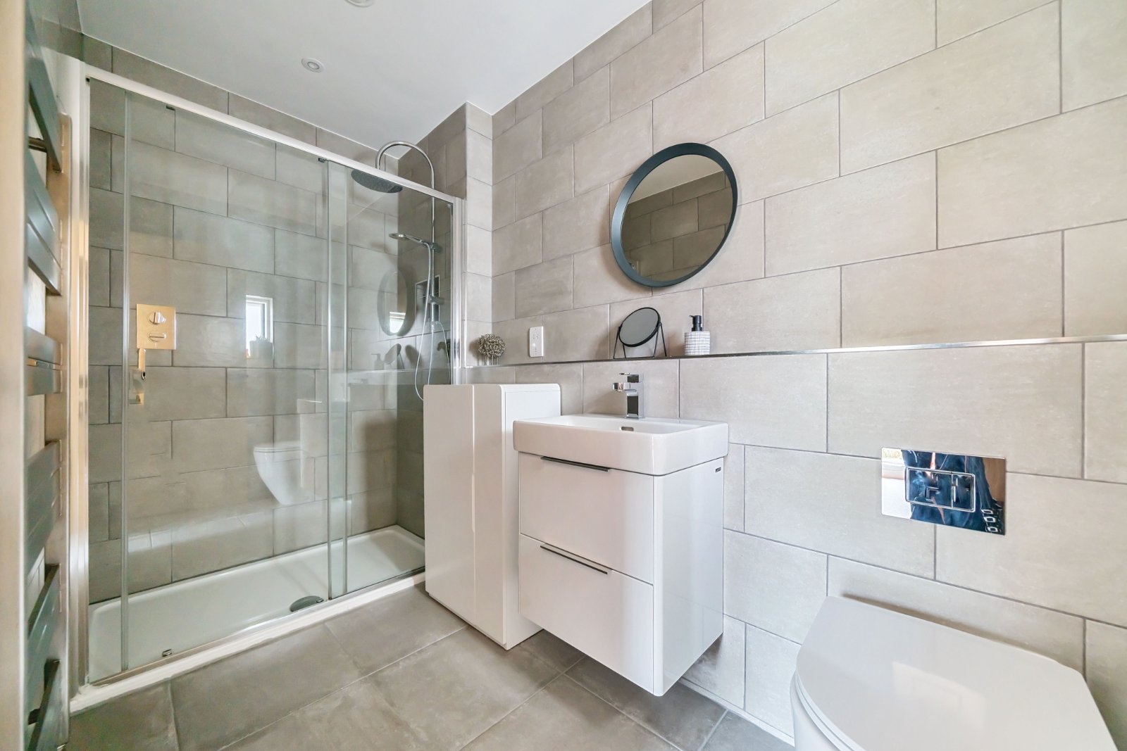 Upstairs, four generously sized double bedrooms include built-in storage. The luxurious principal suite benefits from a sleek ensuite bathroom, while a contemporary family bathroom serves the remaining bedrooms.