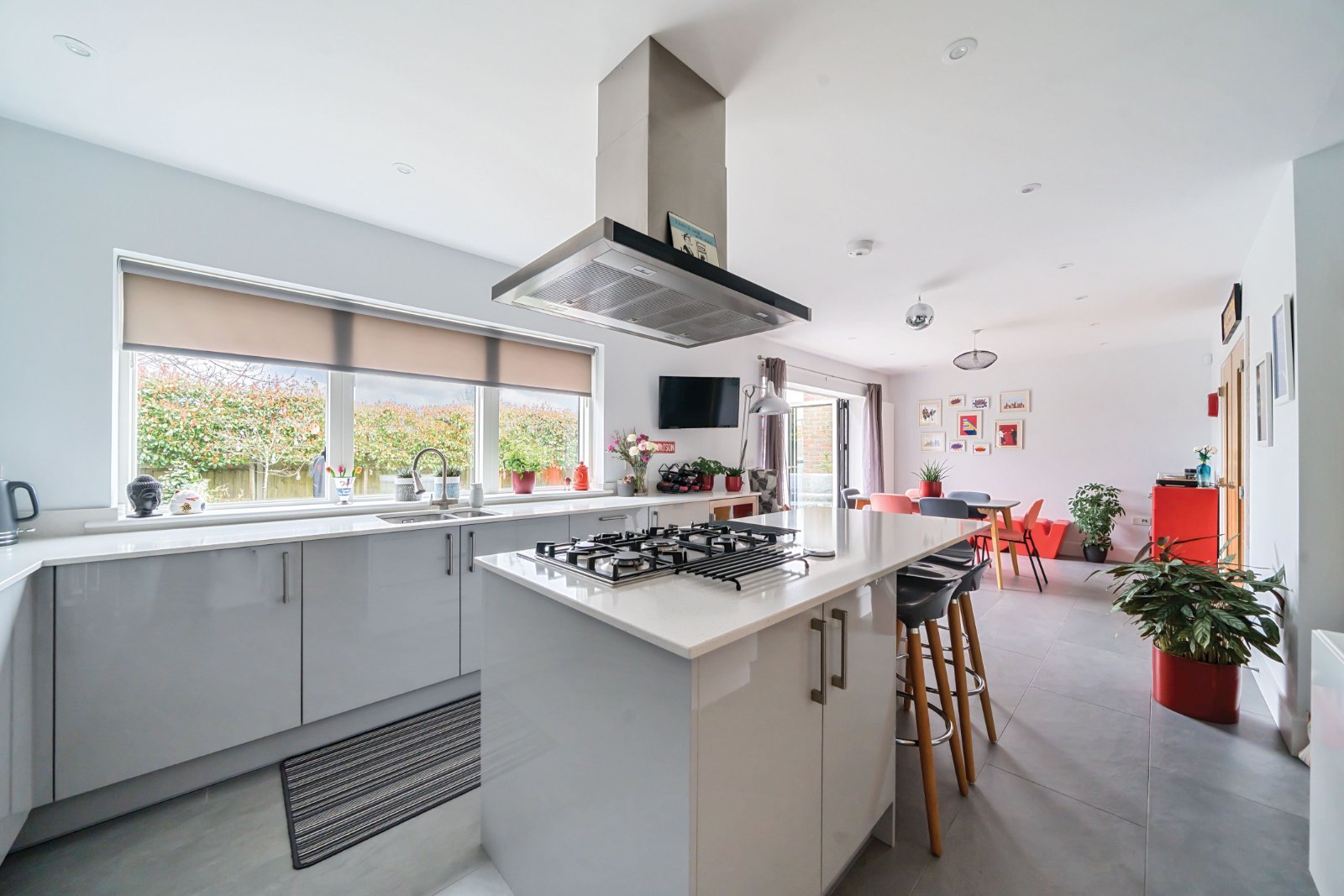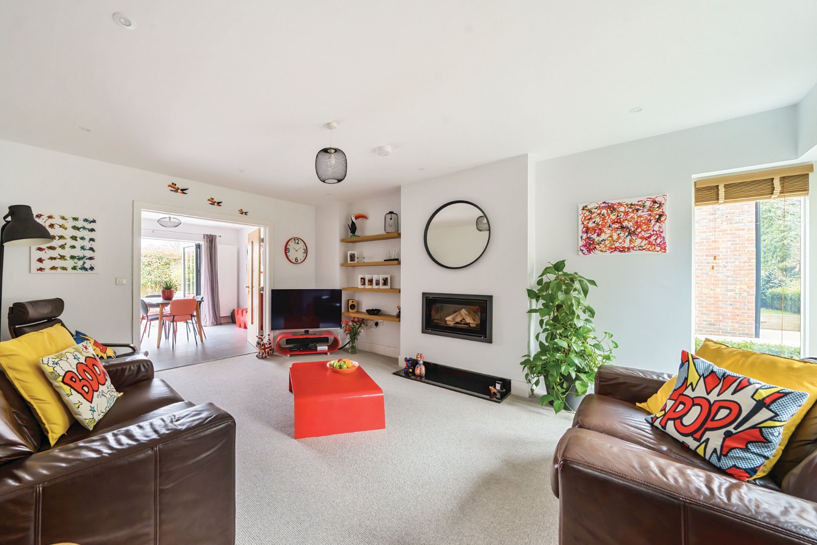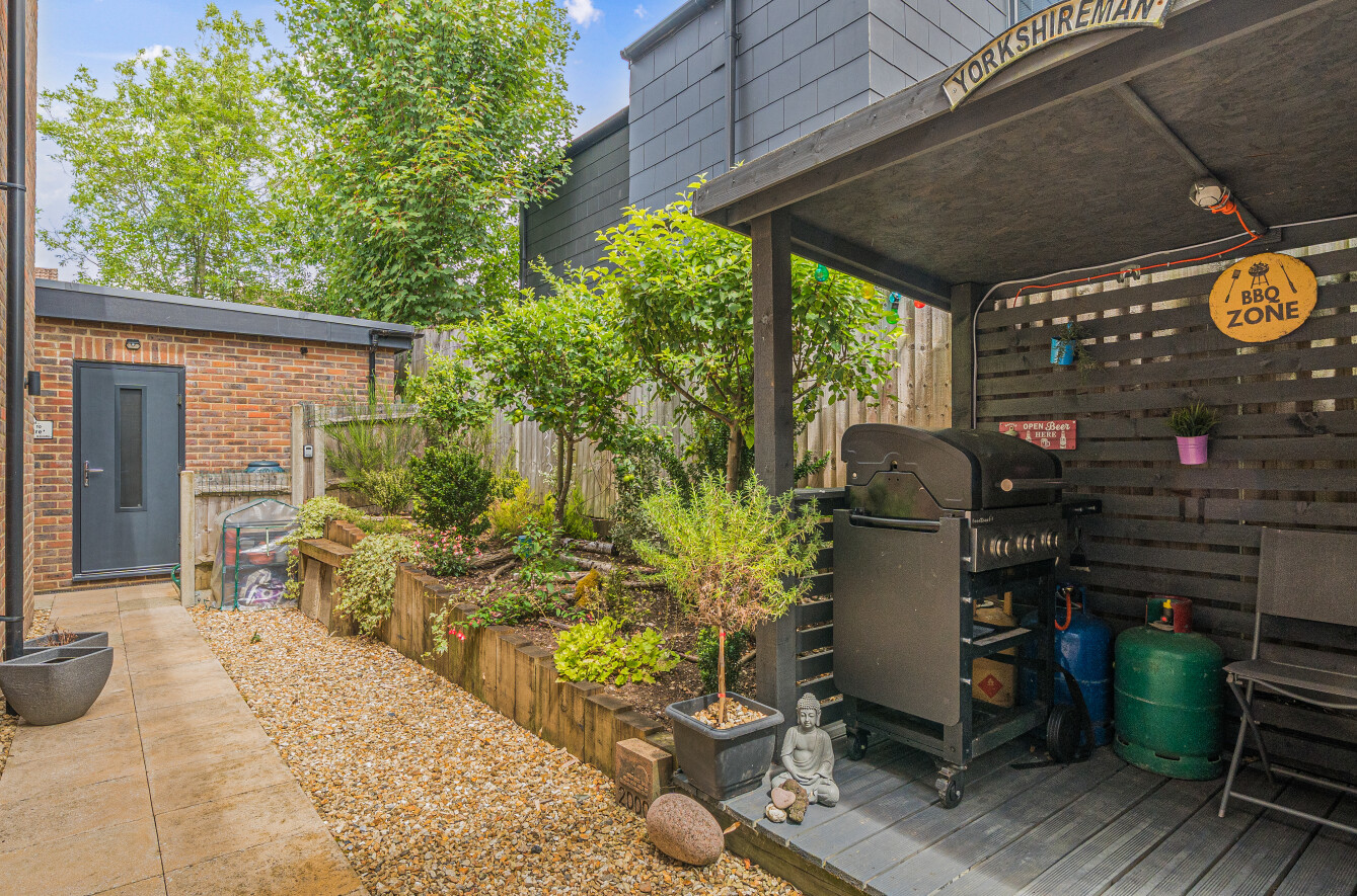 The ground floor boasts a spacious living room, highlighted by a stylish log burner and double doors leading to the breathtaking open-plan kitchen and dining area. Designed for modern living, the kitchen features a large island, premium built-in appliances, and a wine fridge, with ample space for a family dining table. Bi-fold doors open onto a beautifully landscaped garden with a lawn and multiple patio areas, perfect for outdoor entertaining. A separate utility room adds practicality, while a versatile study offers the flexibility to serve as a home office or fifth bedroom.