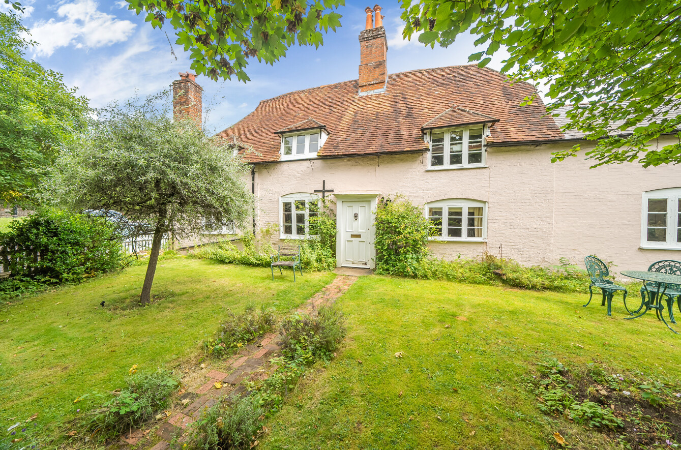 The property is accessed via a picket fence and gate, opening to a neatly maintained lawned garden with lovely views of St Mary's Church. A gravel driveway leads to a weather-boarded barn with an open-fronted garage and a home office/studio with a power supply. The expansive rear garden is enclosed and well-maintained, featuring mature trees, seating areas, and a variety of plants. There is also a convenient off-road parking area with a garden shed and carport.
