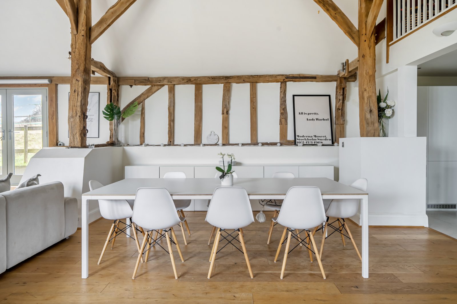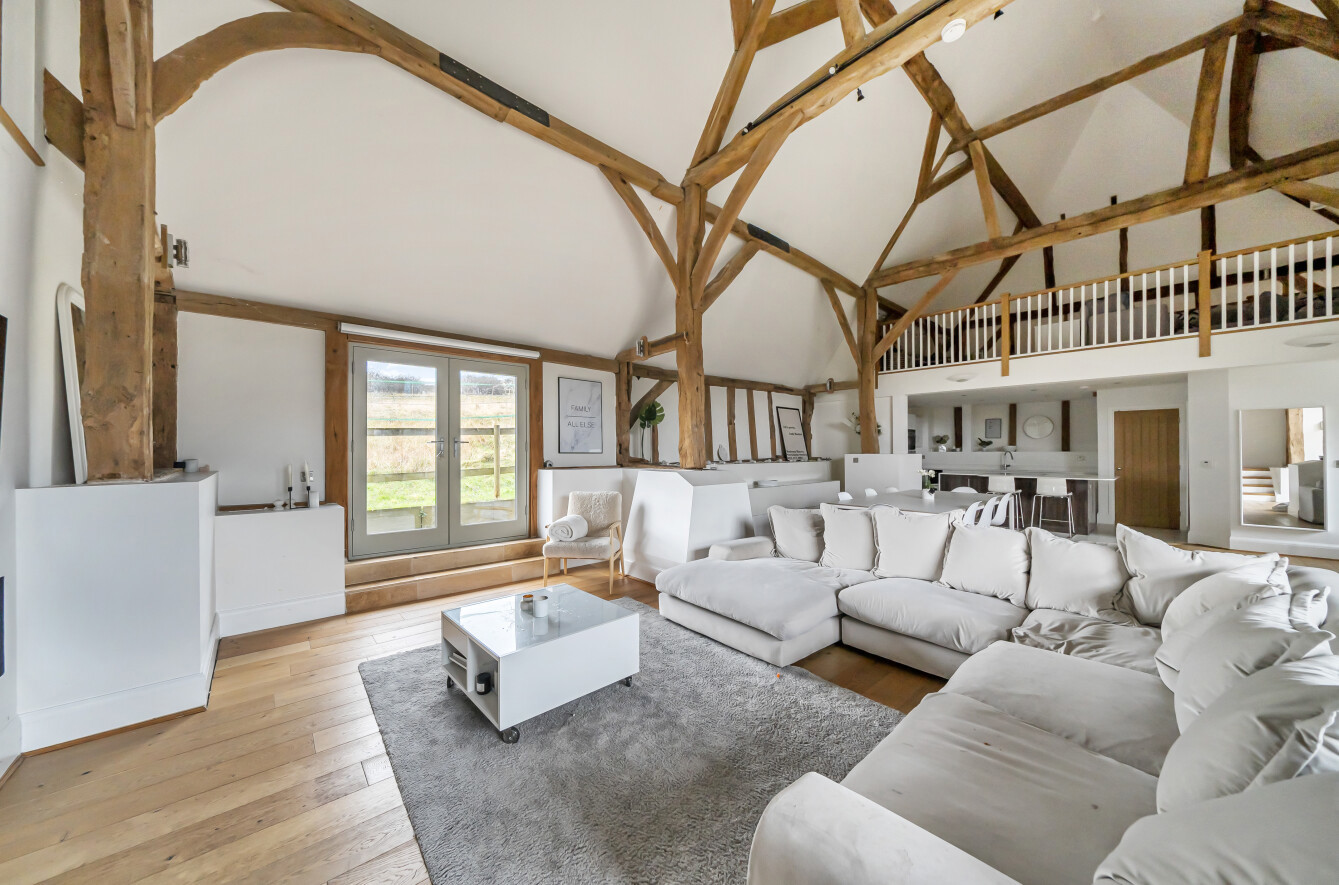 Internally the property offers a large open-plan kitchen/breakfast/dining/family room with stunning and dramatic vaulted ceilings, this open plan space spans almost 30ft with separate areas designated, providing an amazing entertaining and family space. The four bedrooms all occupy one end of the property with three comfortable rooms on the ground floor, bedroom two benefits from an en-suite with the luxury family bathroom serving the further two bedrooms. The main principal bedroom is located on the first floor with a further en-suite and built in wardrobe, there is also a mezzanine sitting room offering a further flexible space, which benefits from overlooking the main room. The opposite end of this family home provides a separate study, utility boot room and another mezzanine reception space currently being used as a play room/snug. There are multiple French doors leading to the outside space for convenient living and the opportunity to take in the surrounding South Downs National Park and the views. The property sits on a plot in the region of 0.2 acres with the main garden towards the front making the most of the sunny orientation, the garden is mainly laid to lawn with patio areas perfect for alfresco dining. The property has two allocated parking spaces directly in front of the gate and a feature off set single garage.