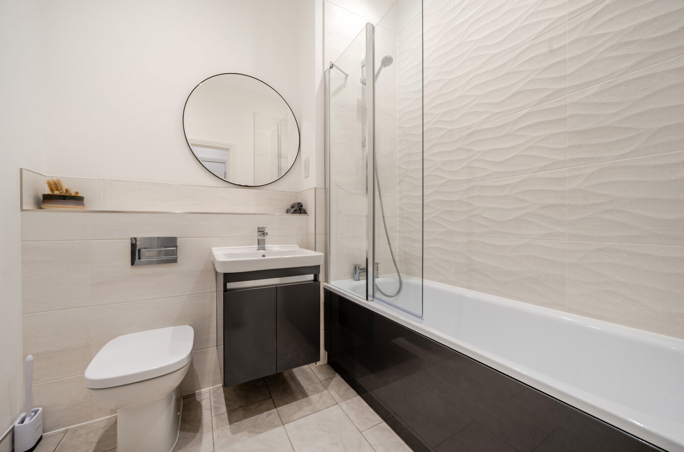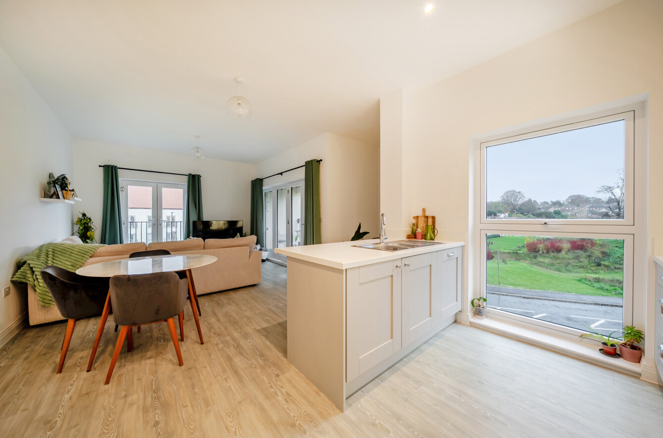 The property is bright and airy throughout, with a spacious hallway leading to an open-plan kitchen and living area. The kitchen is a stylish shaker design, fitted with white quartz worktops and a breakfast bar, combining practicality with a modern, clean aesthetic. High ceilings in the living area further enhance the sense of space.