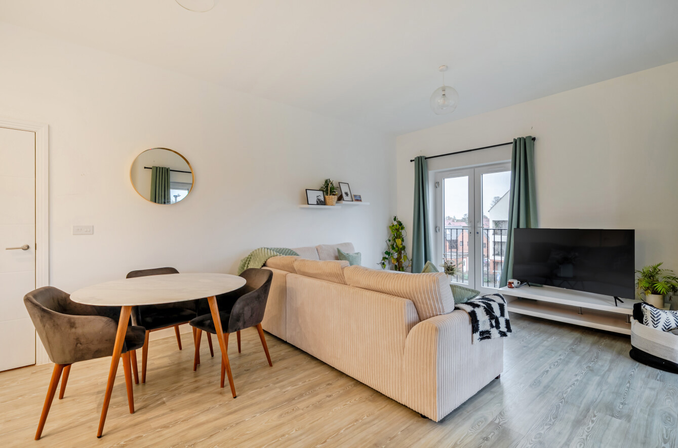 A private balcony extends from the living space, offering a calm outdoor retreat. The apartment comprises two double bedrooms, including a principal suite with an en-suite shower room, alongside a separate family bathroom.