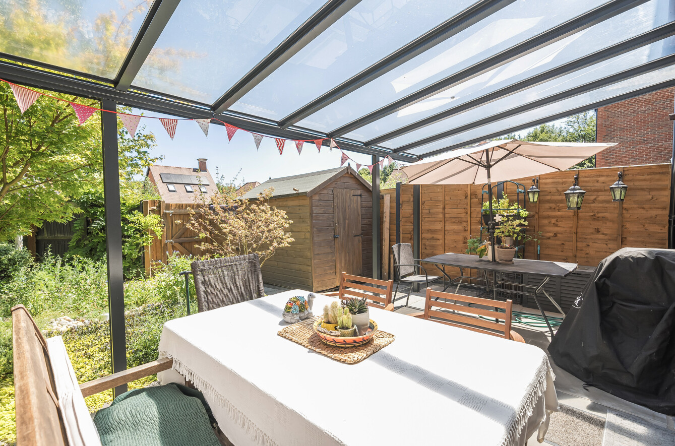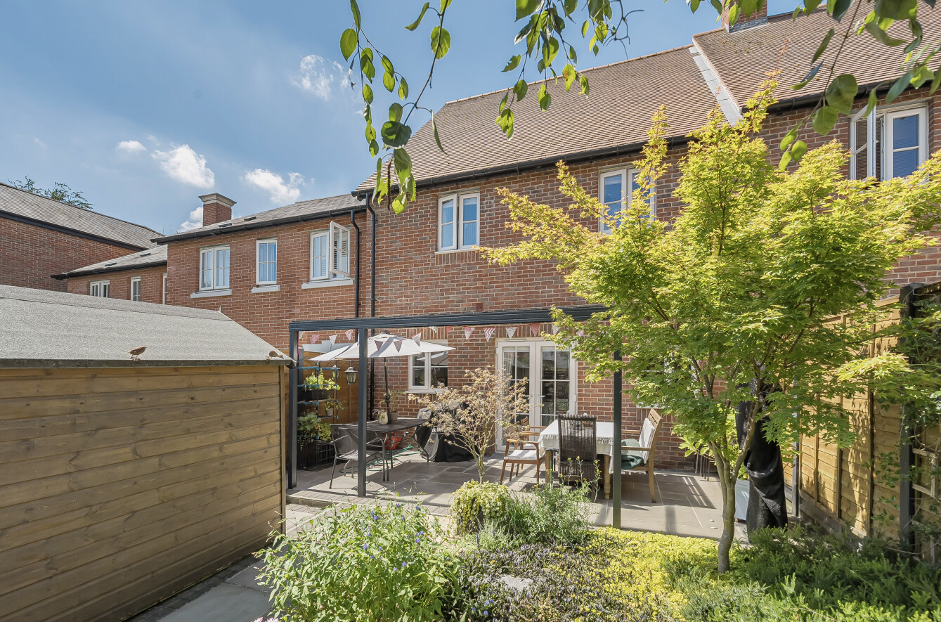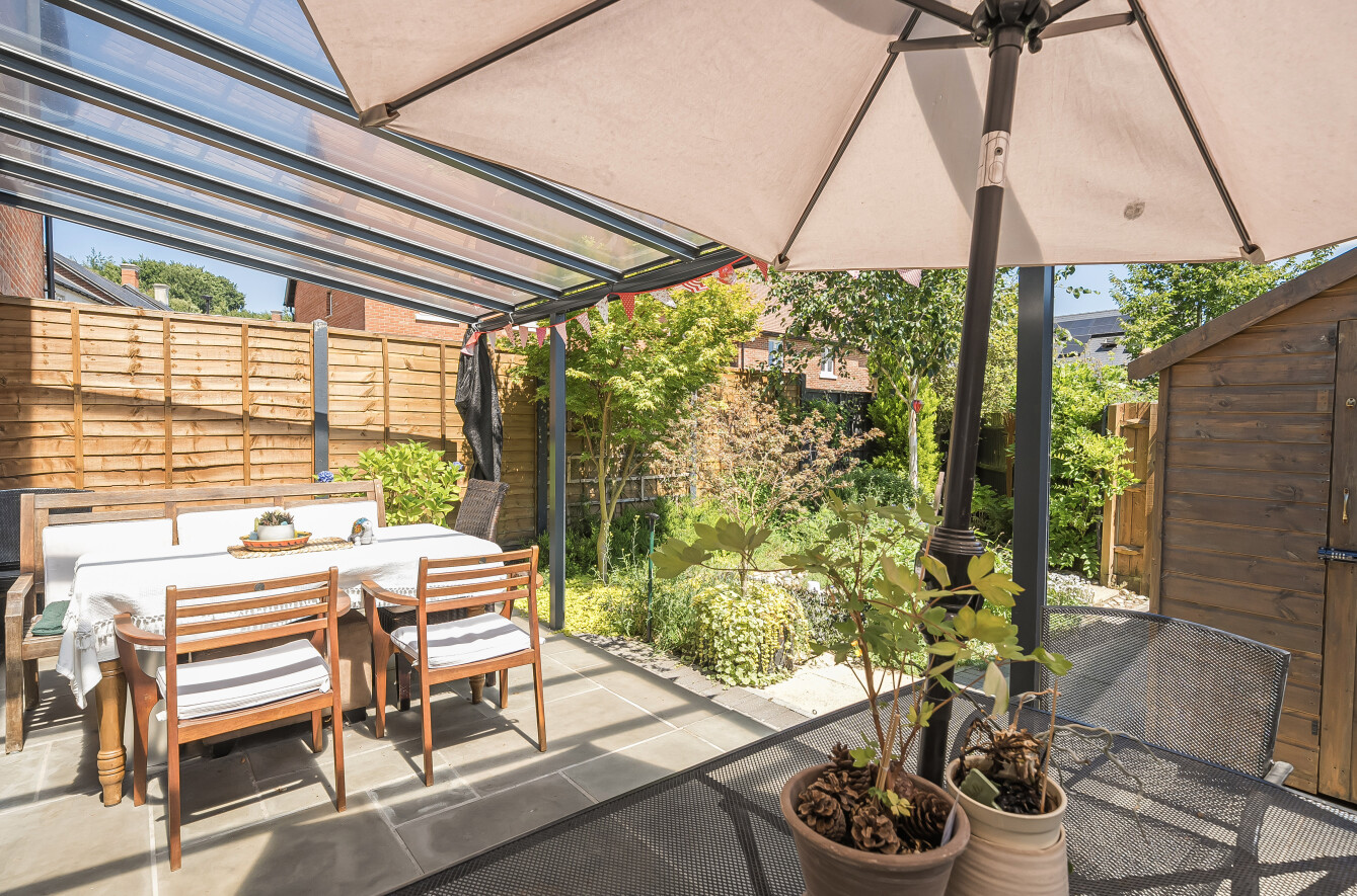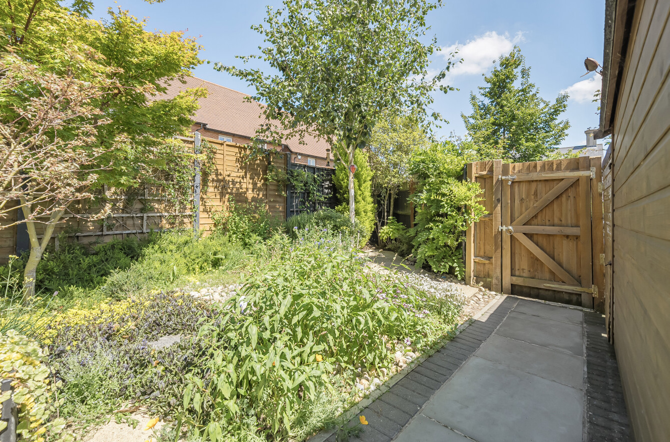 The private rear garden is an oasis of greenery, with a well-maintained patio, mature planting, and a wooden shed that offers practical outdoor storage. The property also benefits from an outbuilding and on-street parking.