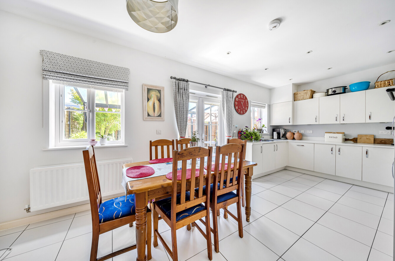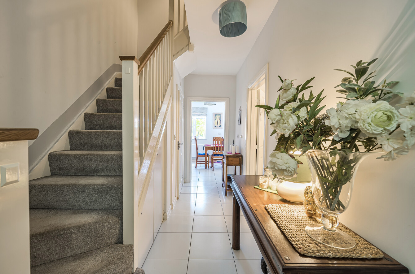 Upstairs, the home offers three well-proportioned bedrooms. The principal bedroom includes a generous built-in wardrobe and overlooks the rear garden, while bedrooms two and three provide flexible space for family, guests, or a home office. The family bathroom is stylish and modern, complemented by a convenient additional WC downstairs.