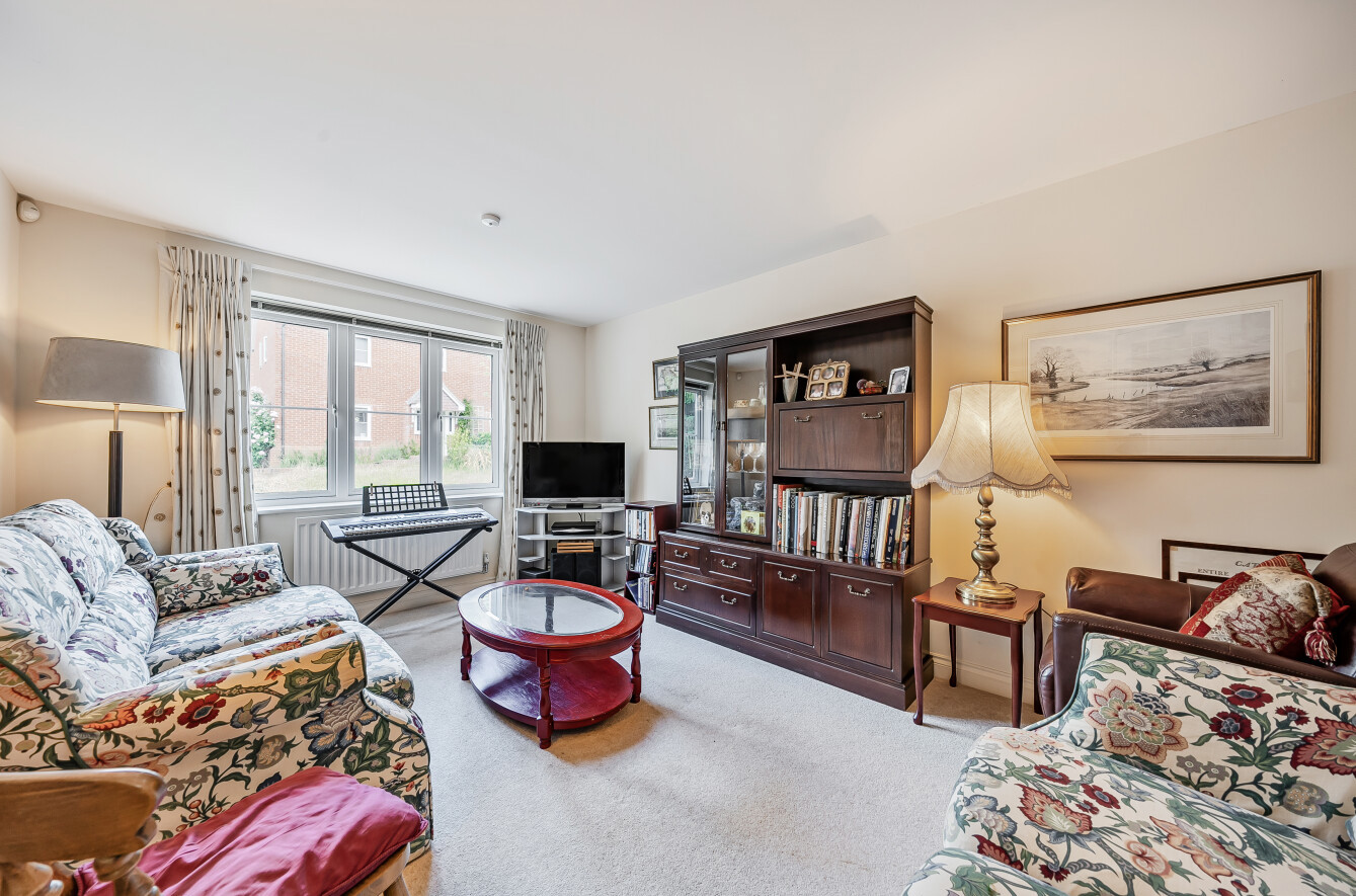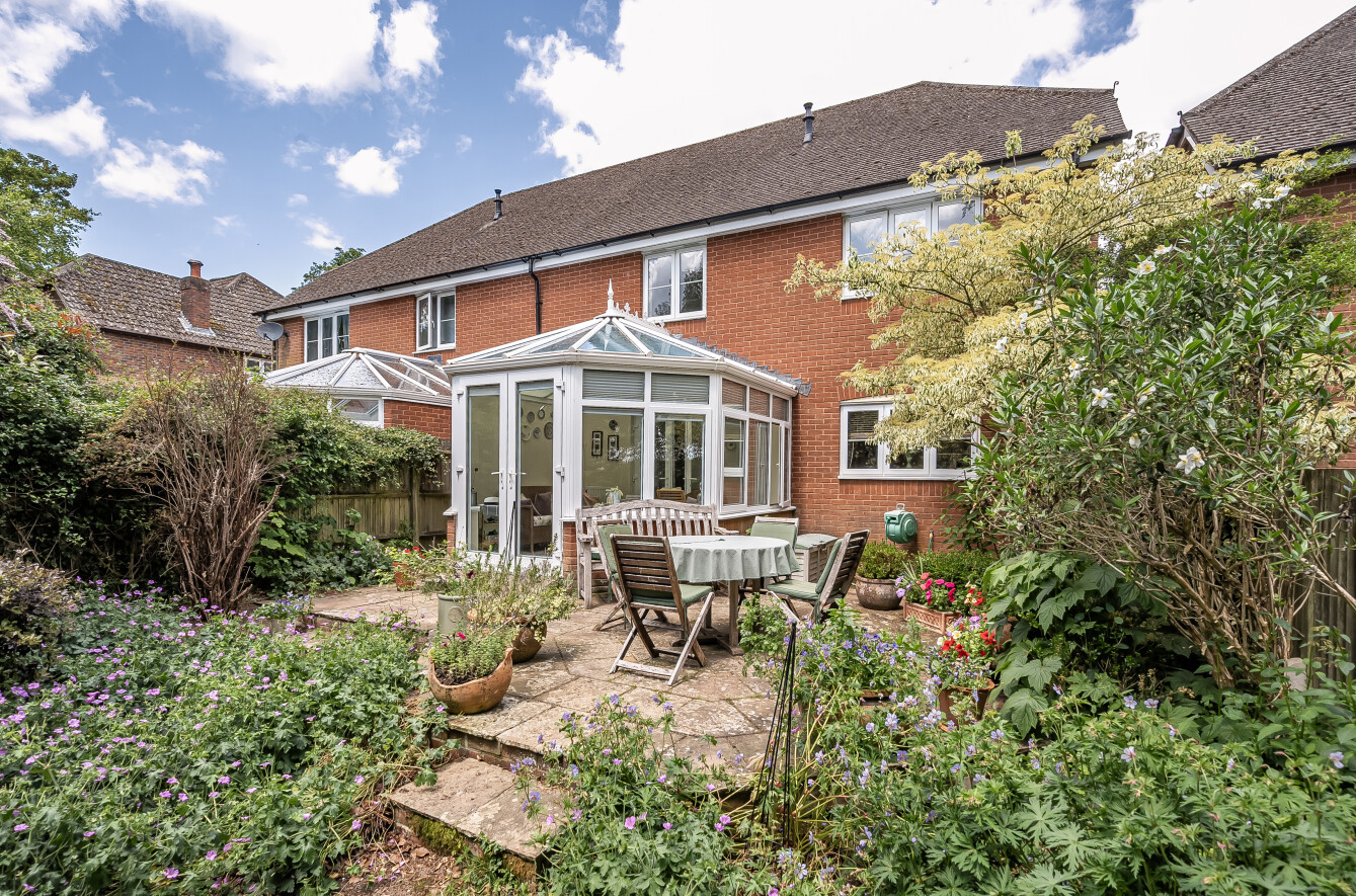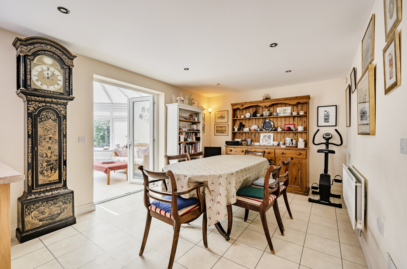 Step inside to a spacious entrance hall laid with elegant flooring, offering internal access to the garage, effortless flow through to the main living areas and access to the guest cloakroom under the stairs. At the front of the house, a light-filled sitting room provides a calm and welcoming environment. To the rear of the house, the standout feature is a substantial open-plan kitchen and dining area. The kitchen is fitted with practical wood-look units, with generous worktop space and integrated AEG appliances. Spanning the full width of the house, this area is perfectly suited for family meals and hosting friends. French doors open into the conservatory, which, while bathed in natural light, is sheltered by its west wall from afternoon sun. The conservatory overlooks the secluded and well-tended south-facing garden.
