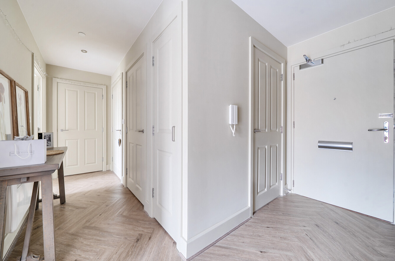 A sleek, modern bathroom includes a shower over the bath and a fitted bathroom cabinet. Floor-to-ceiling windows in every room flood the apartment with natural light, and four generous storage cupboards are conveniently located off the hallway.
