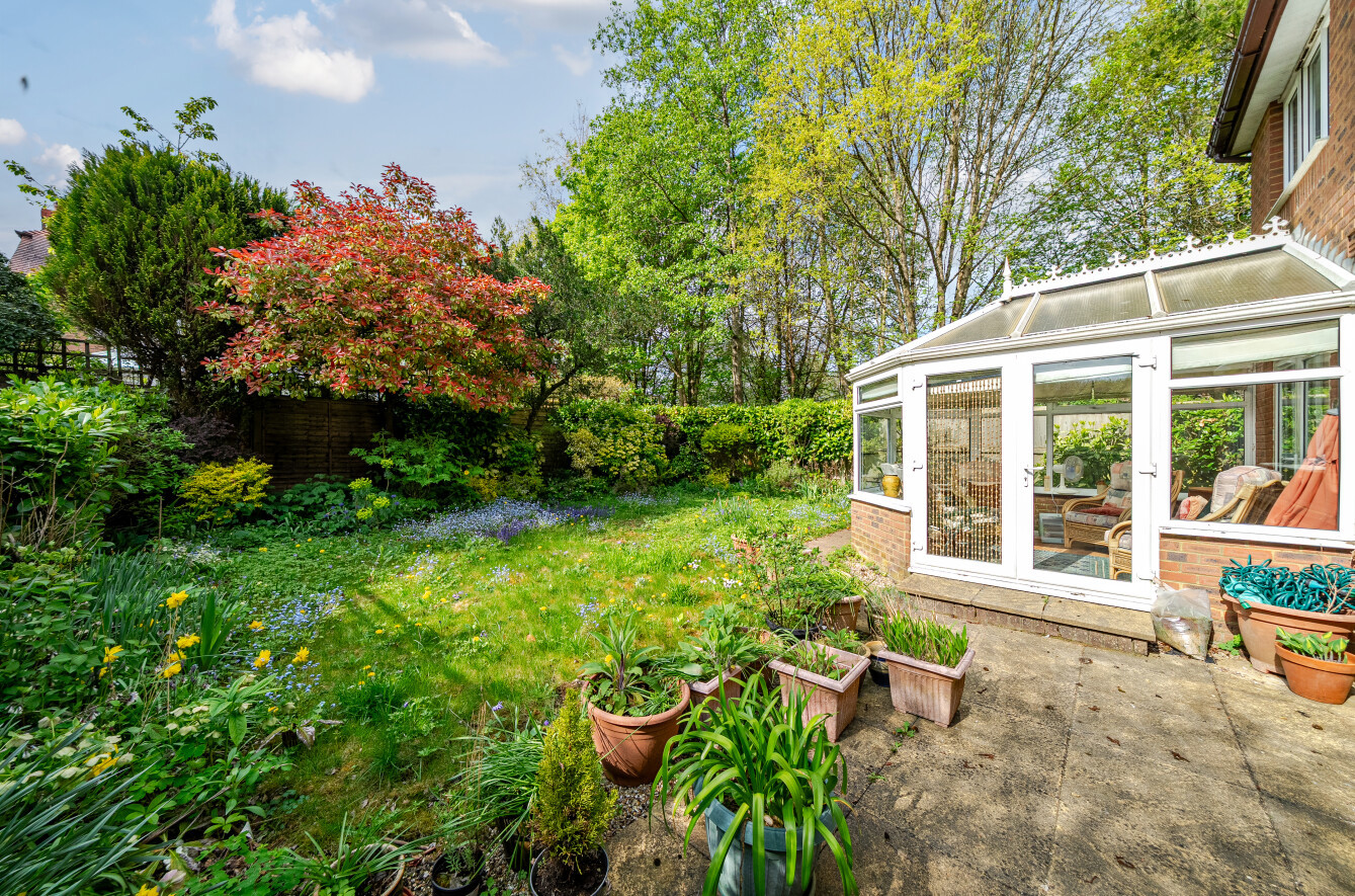 Externally, there is a private driveway providing off-street parking, an integral garage, and a mature front garden. To the rear, the property benefits from a peaceful and private garden, bordered by mature trees.