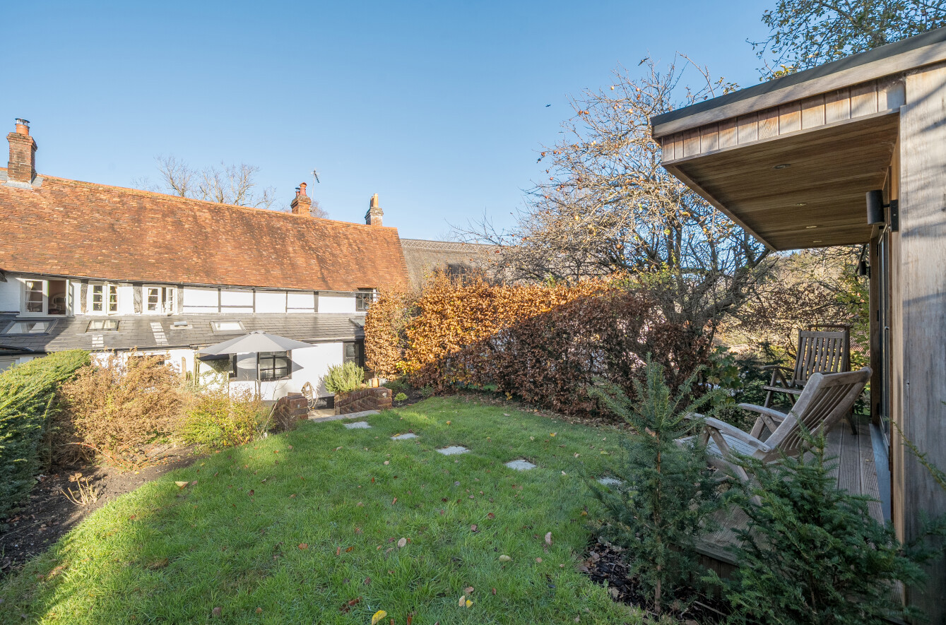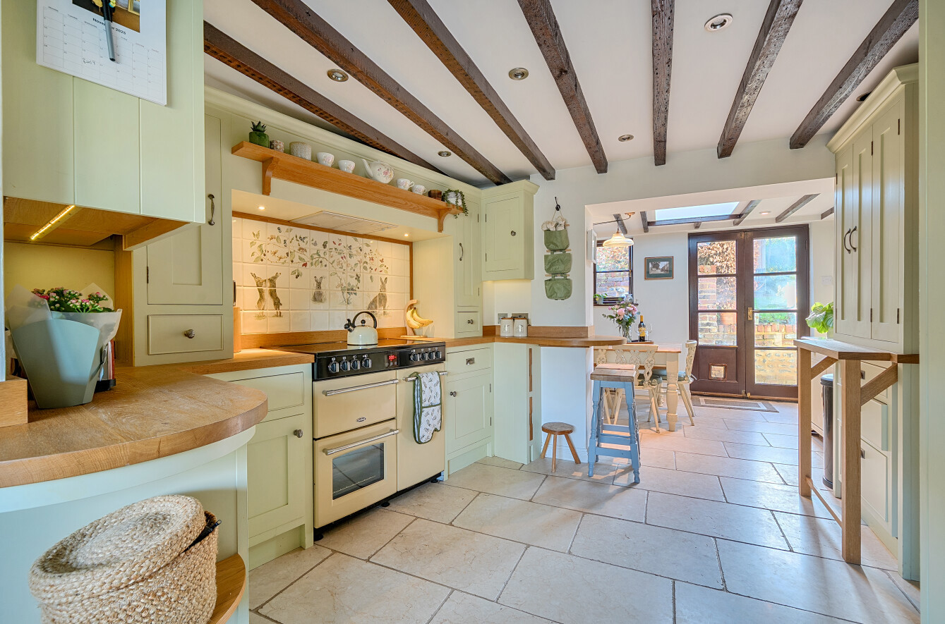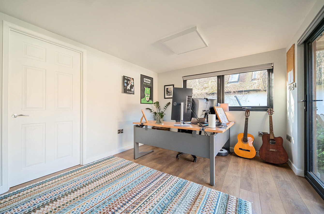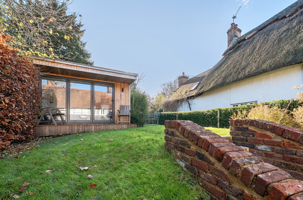 Outside, the garden is an impressive size for the village, with both a lawn and a patio creating a delightful setting for outdoor enjoyment. A substantial outbuilding includes a large home studio with underfloor heating and power, along with a separate store room, making it ideal for creative pursuits, home working, or hobbies.