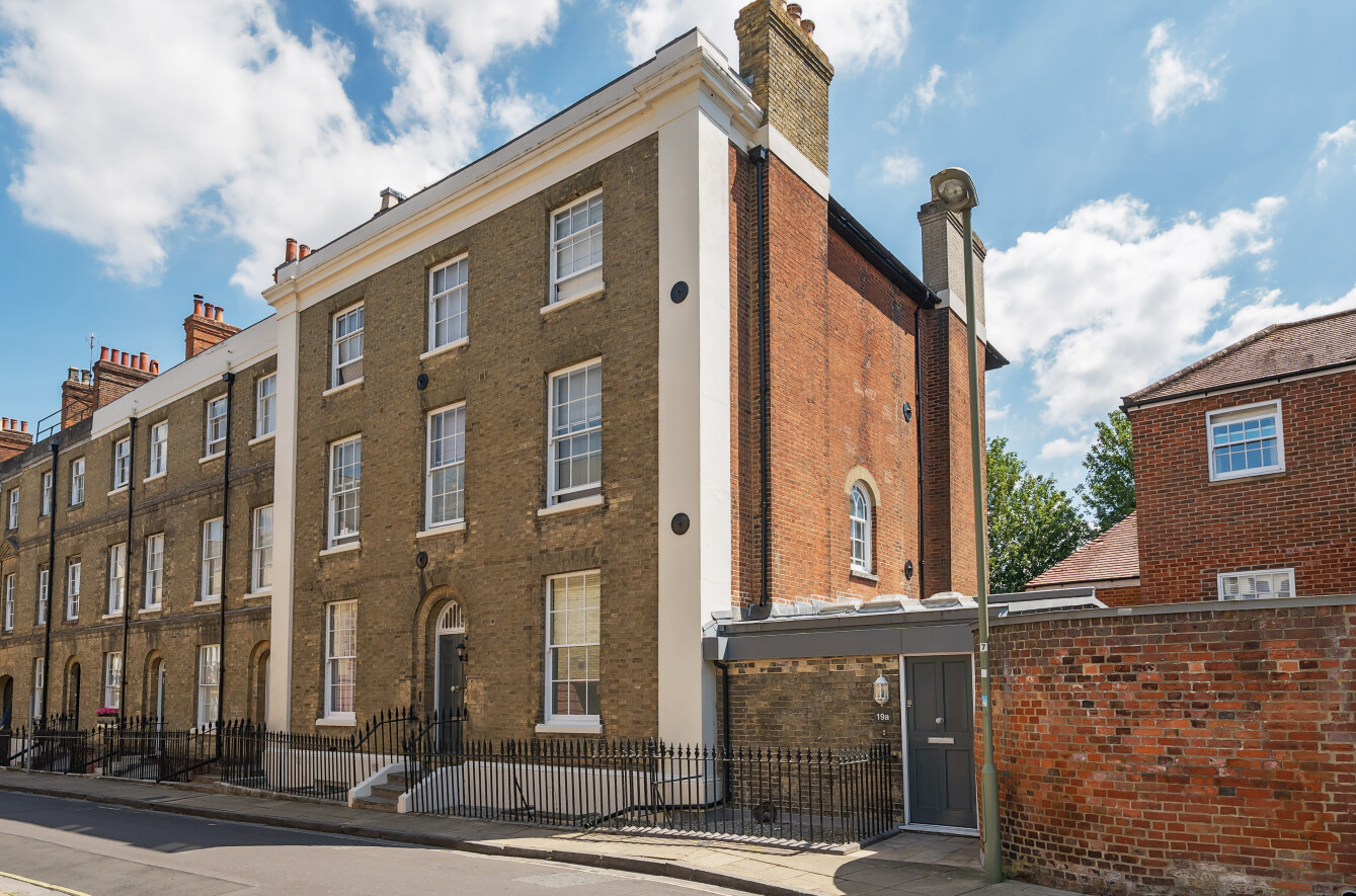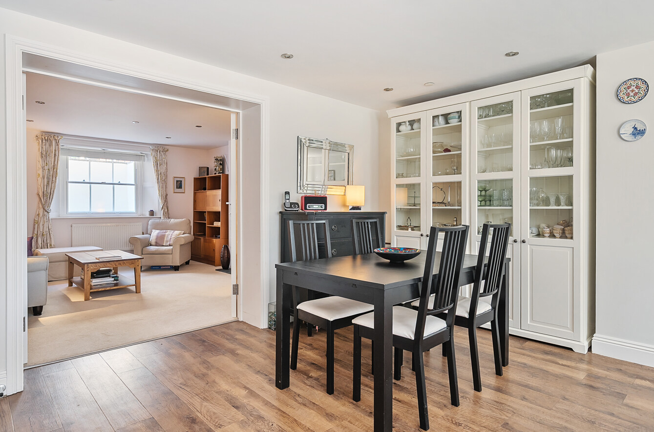 The apartment has two entrances, one from St. Peter Street and another from Parchment Street, providing easy access. Inside, a central hallway with storage leads to a spacious principal bedroom with ensuite, and a bright open-plan kitchen and dining area featuring a large sash window.