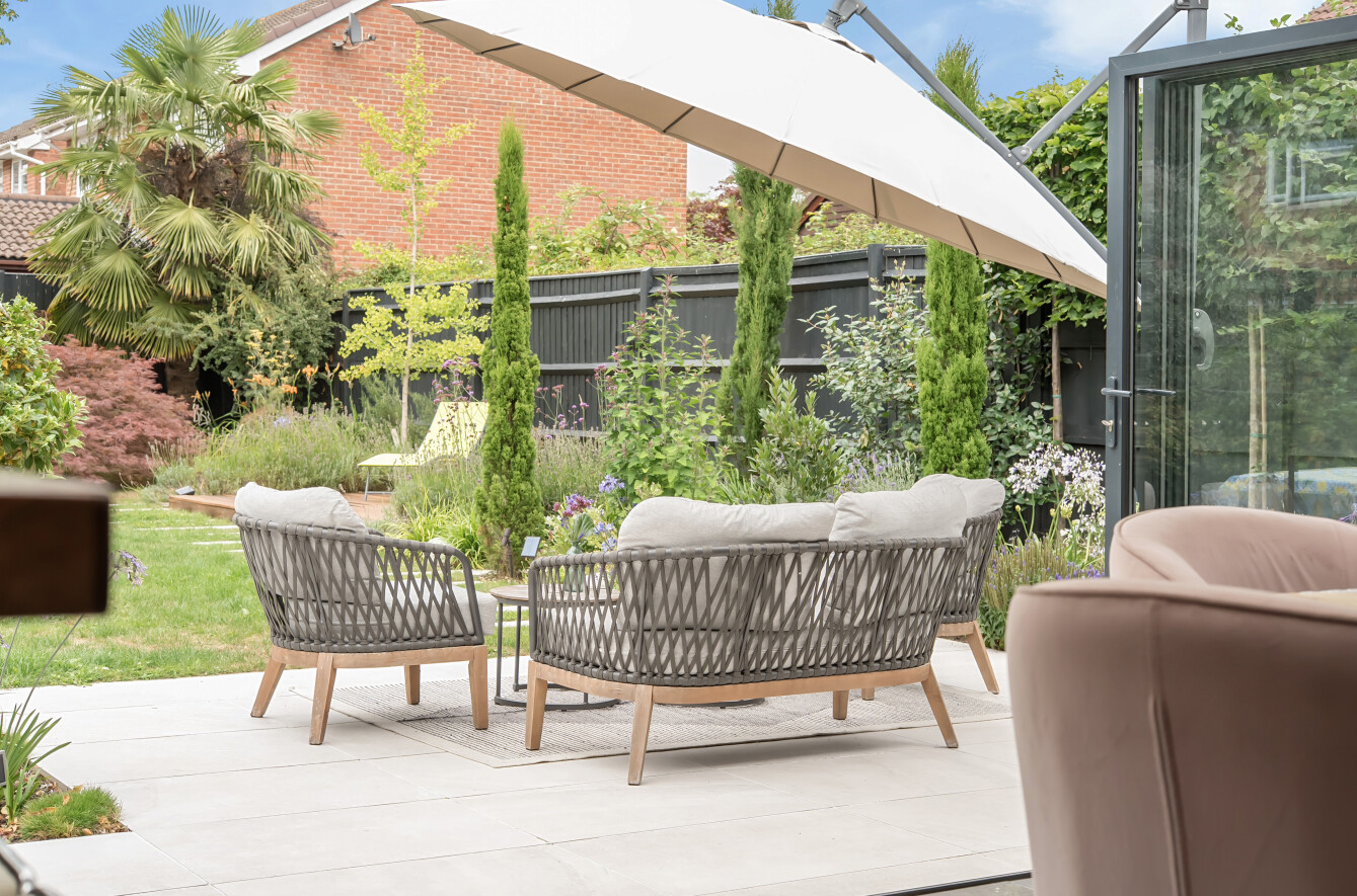 The main bedroom is spacious and calm, ideal for relaxing at the end of the day. Outside, the garden is private and south-facing, and backs onto open green space, with a patio area ideal for outdoor dining. A detached garage offers additional storage or parking.