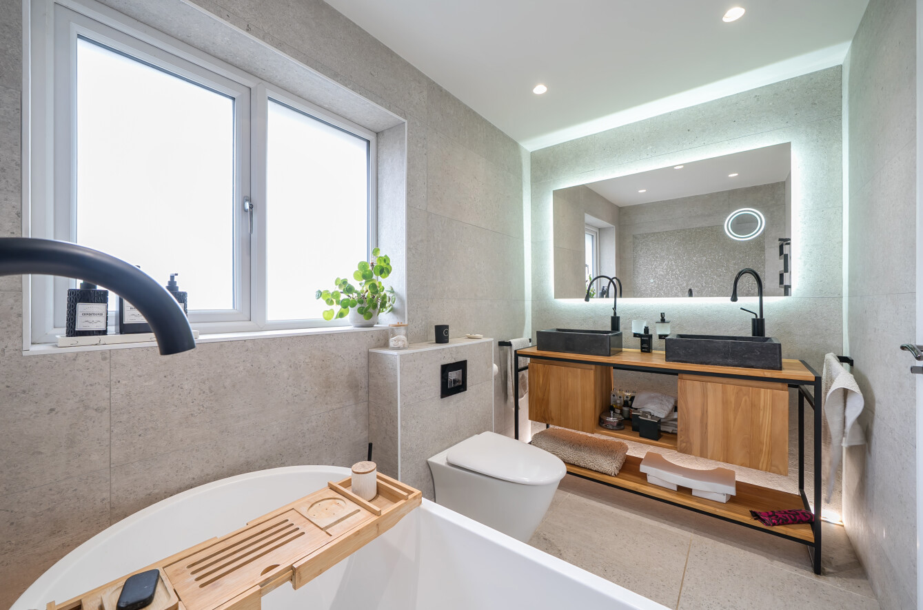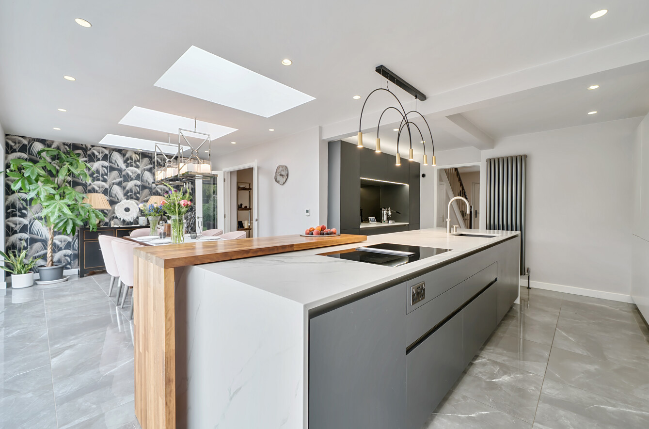 It features a central island with wood accents, sleek modern cabinetry, and glossy tiled flooring. A separate sitting room provides a more private space to unwind, while a home office adds flexibility for remote working or study. Upstairs, there are four well-sized bedrooms, along with a stylish family bathroom.