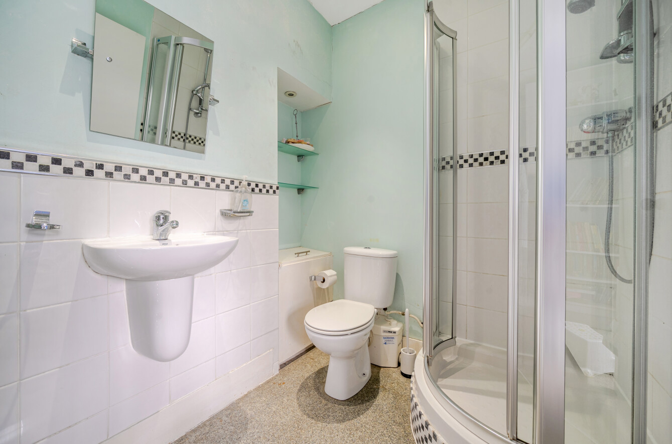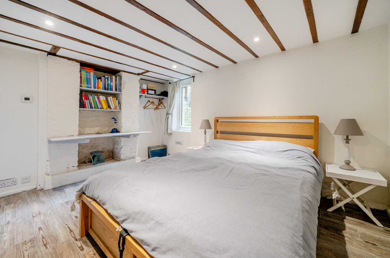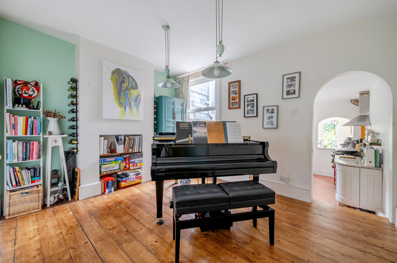 A separate dining room leads through to the well-equipped kitchen, which provides access to a further dining space at the rear overlooking the garden and offering direct access. On the lower ground floor, a generous double bedroom with an adjoining cloakroom and underfloor heating offers excellent flexibility, ideal for guests, a home office, or a teenager’s suite.